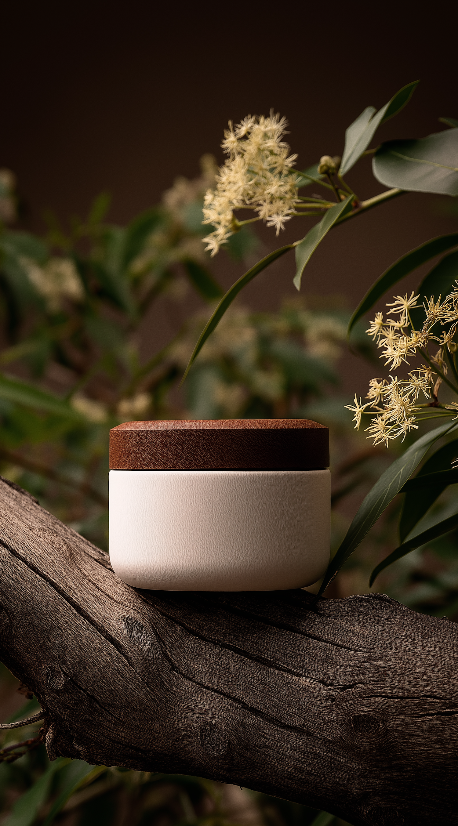 A stylish container with a brown lid rests on a wooden branch, surrounded by green leaves and white flowers, creating a natural aesthetic.