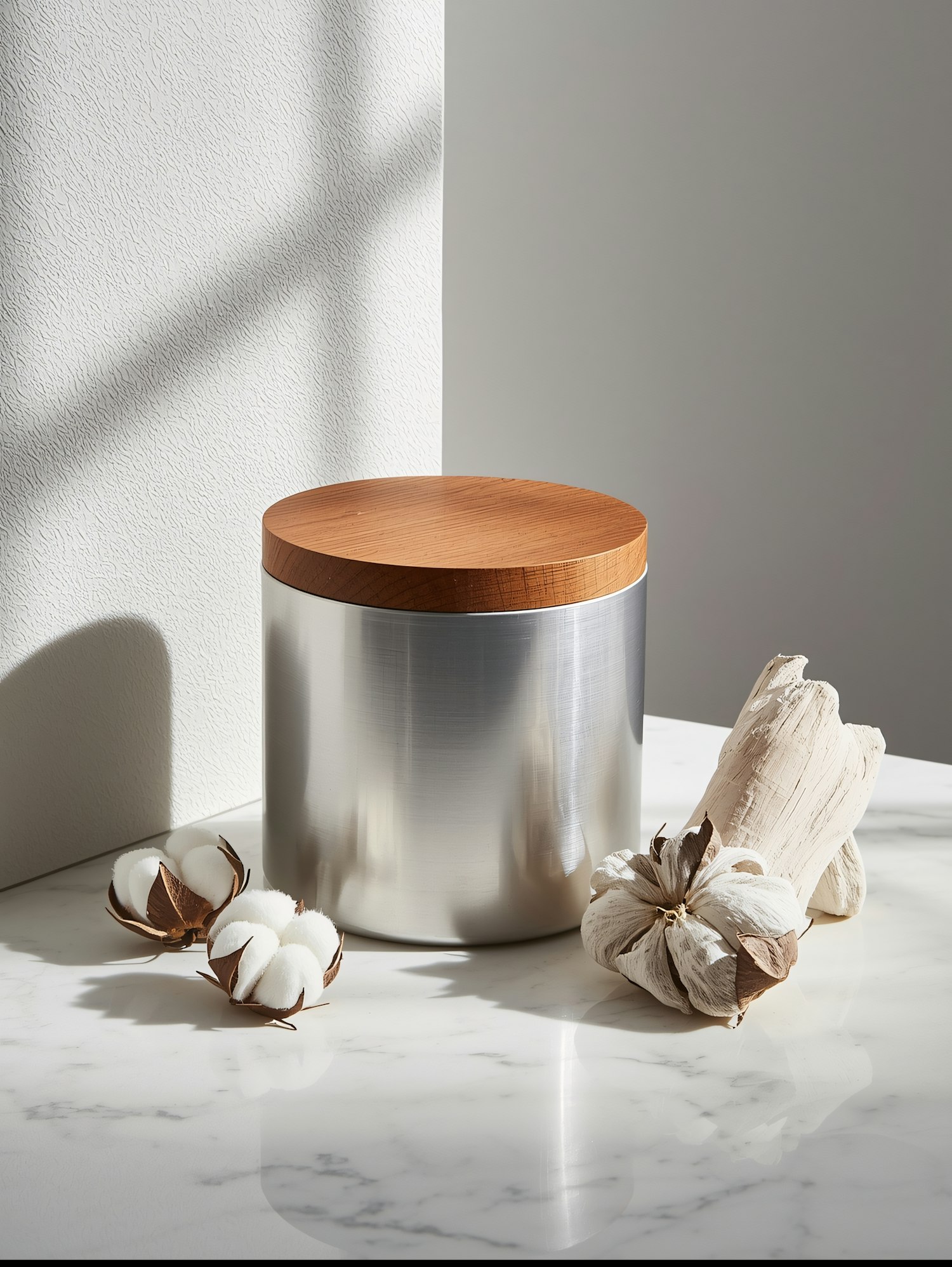 A sleek metal container with a wooden lid on a marble surface, accented by cotton bolls and driftwood in soft natural light.