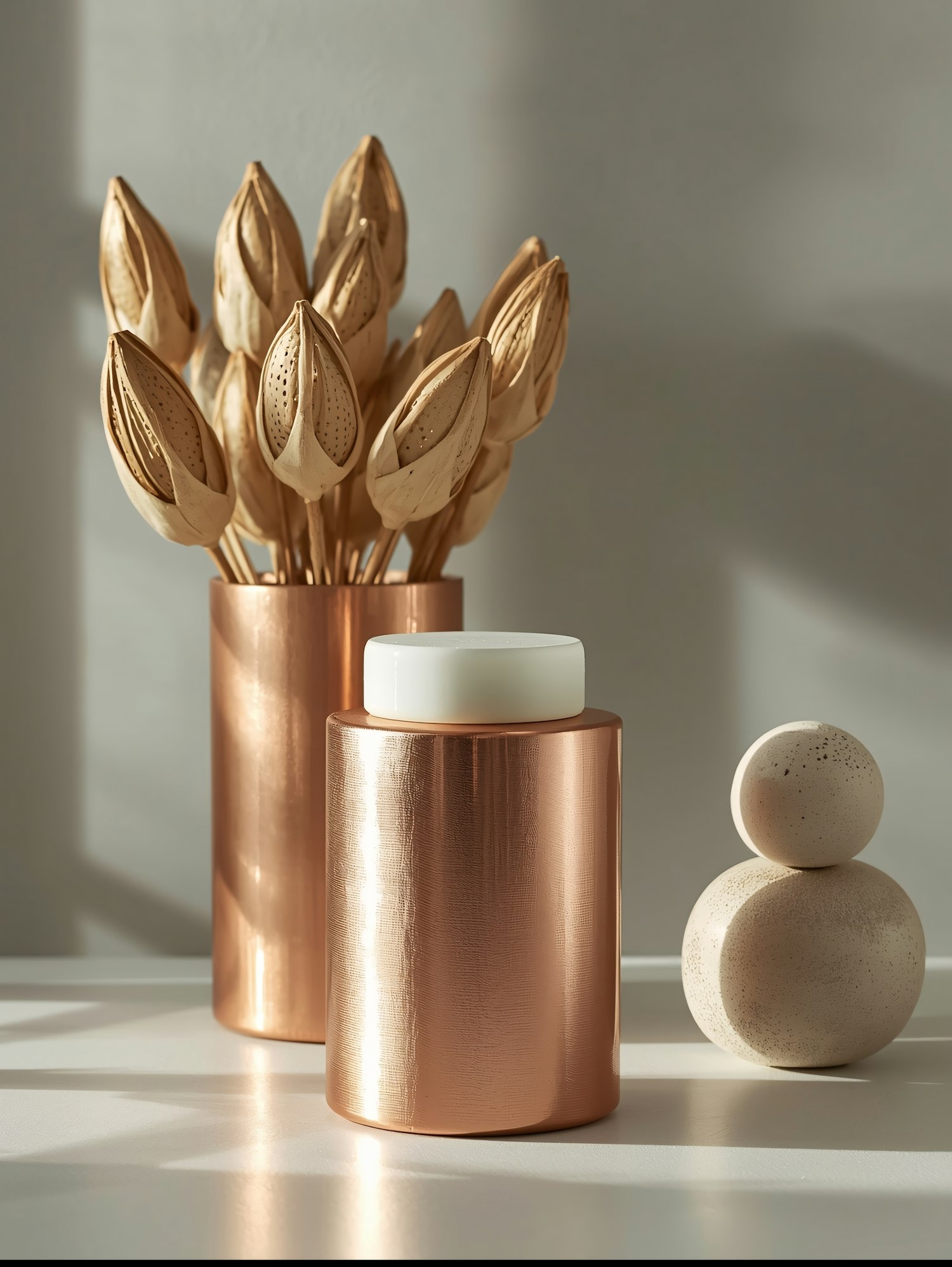 Minimalist decor with a copper vase, dried lotus pods, and a stacked stone sculpture in soft natural light.