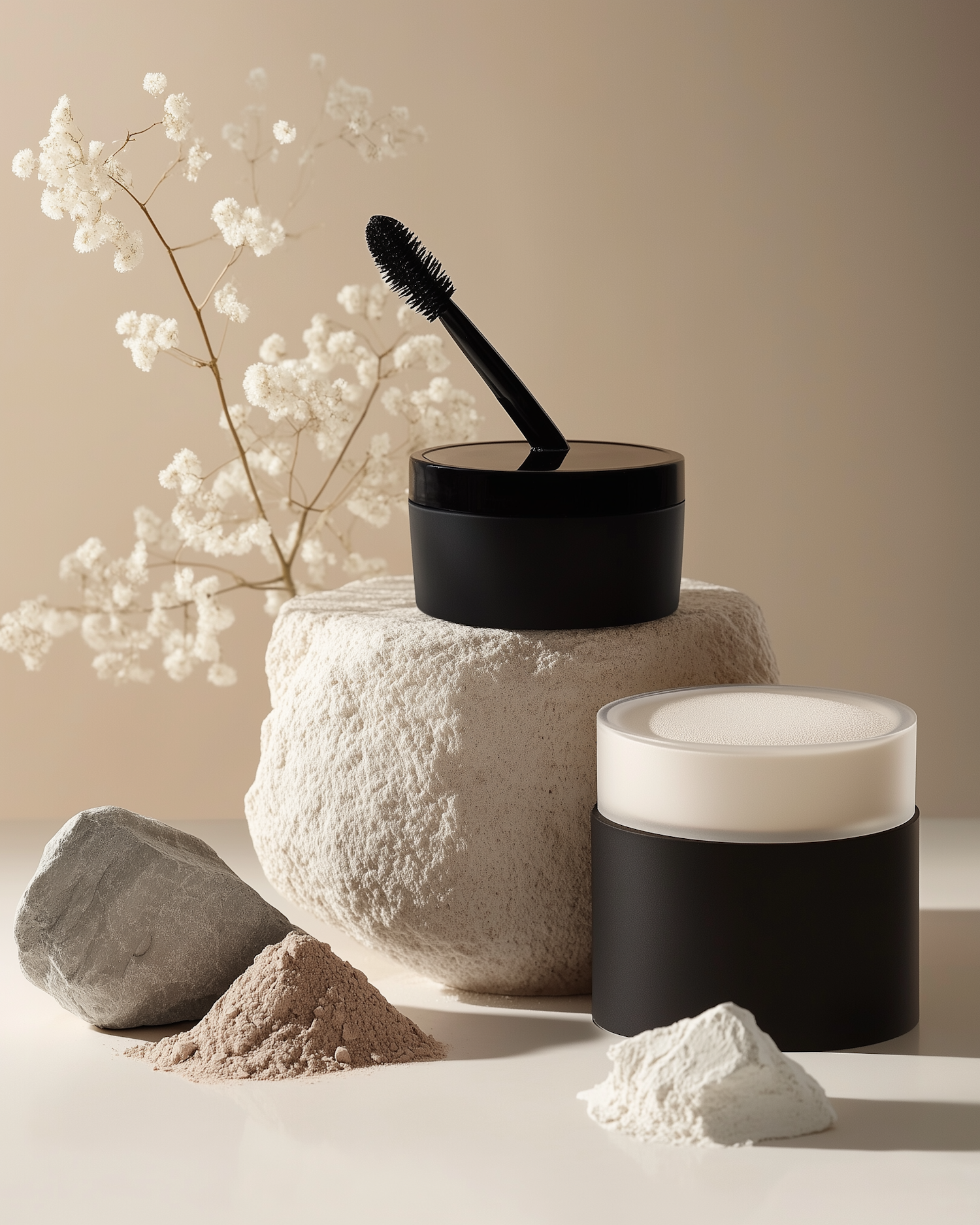 Minimalist beauty setup with black containers, mascara wand, and delicate white flowers on a stone surface.