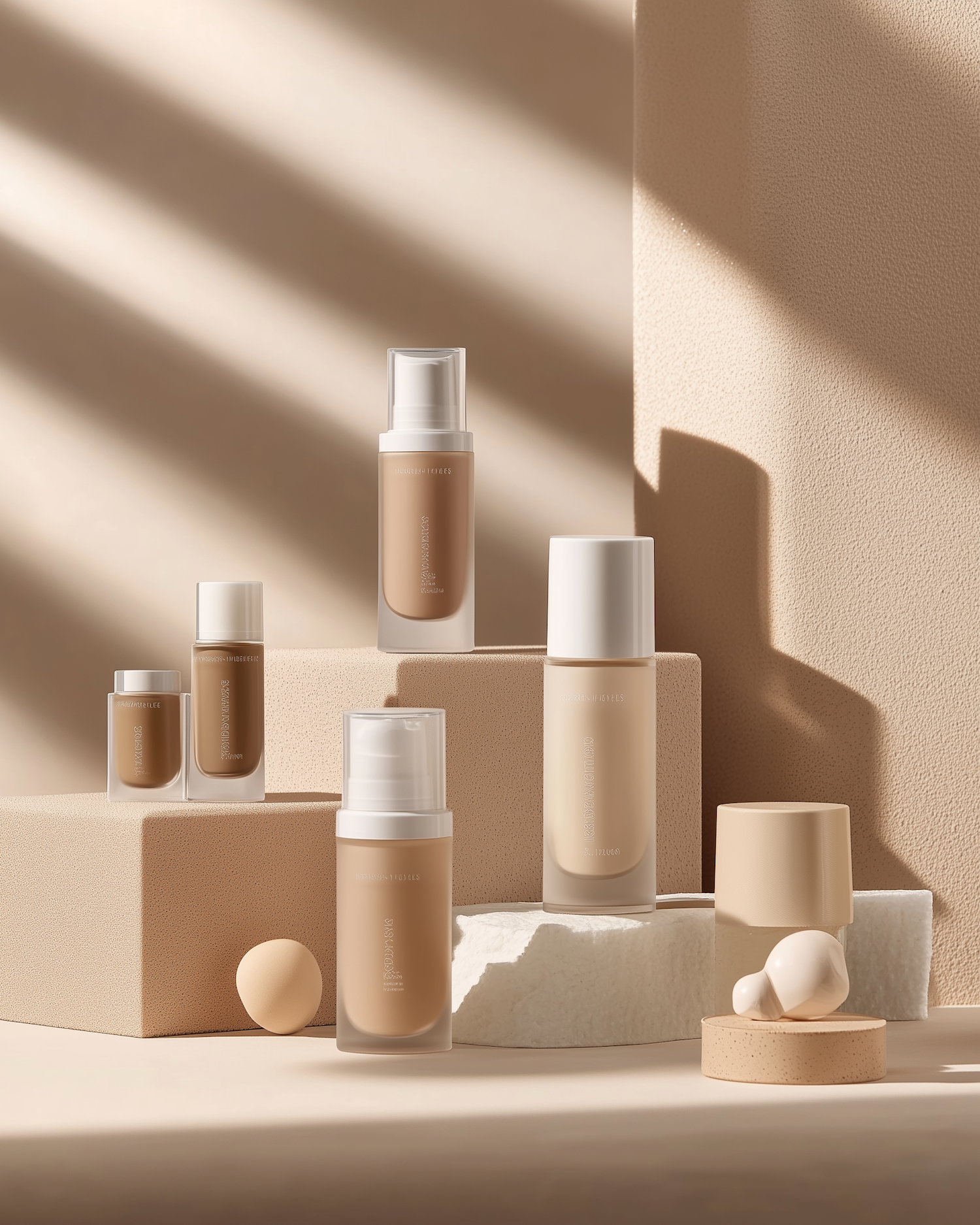 Elegant display of cosmetic bottles in neutral tones, arranged on textured surfaces with soft lighting and shadows.