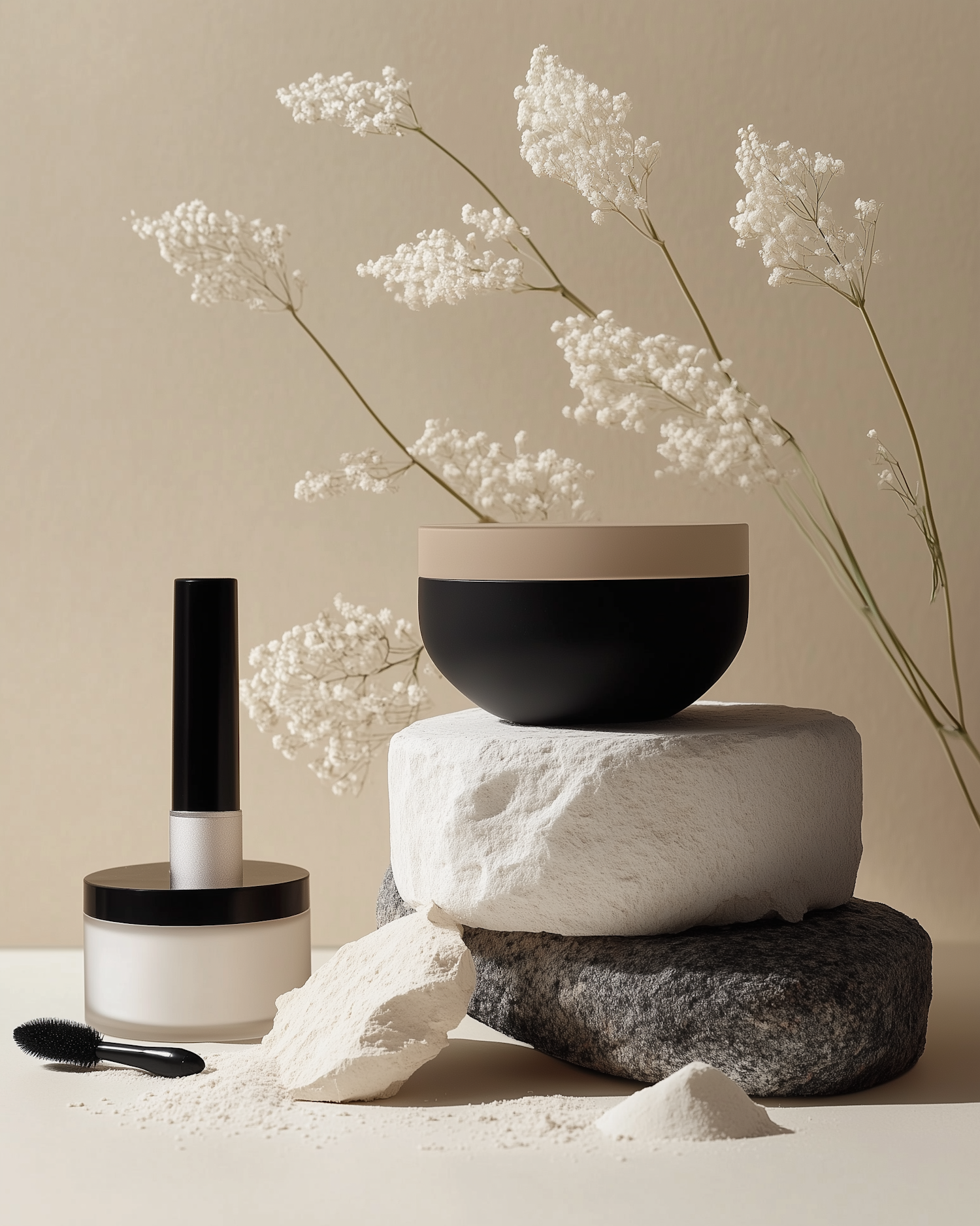 Minimalist beauty product display with stones, white flowers, and neutral tones for a serene aesthetic.