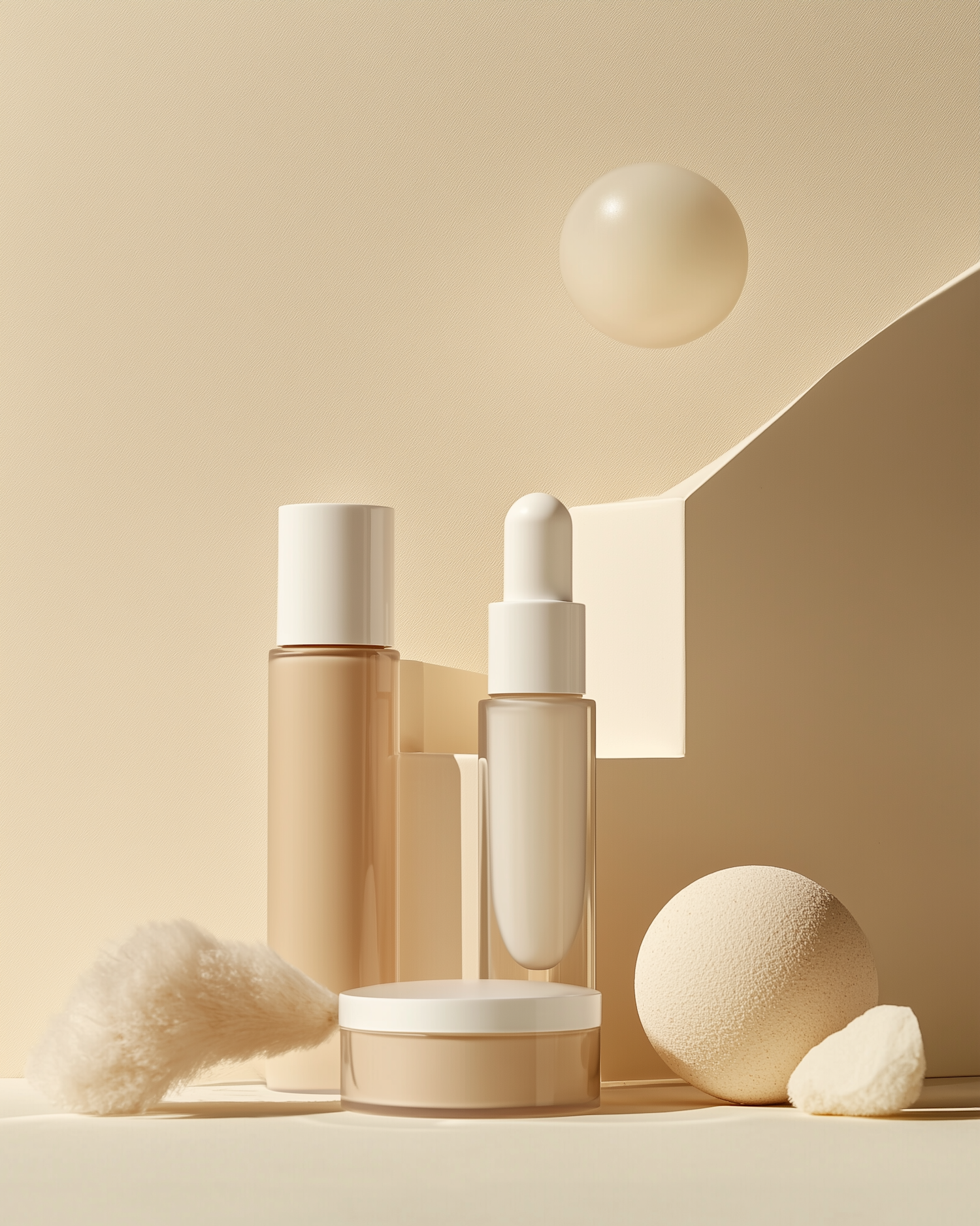 Minimalist skincare product arrangement with beige tones, featuring bottles, a jar, and a fluffy brush on a soft background.