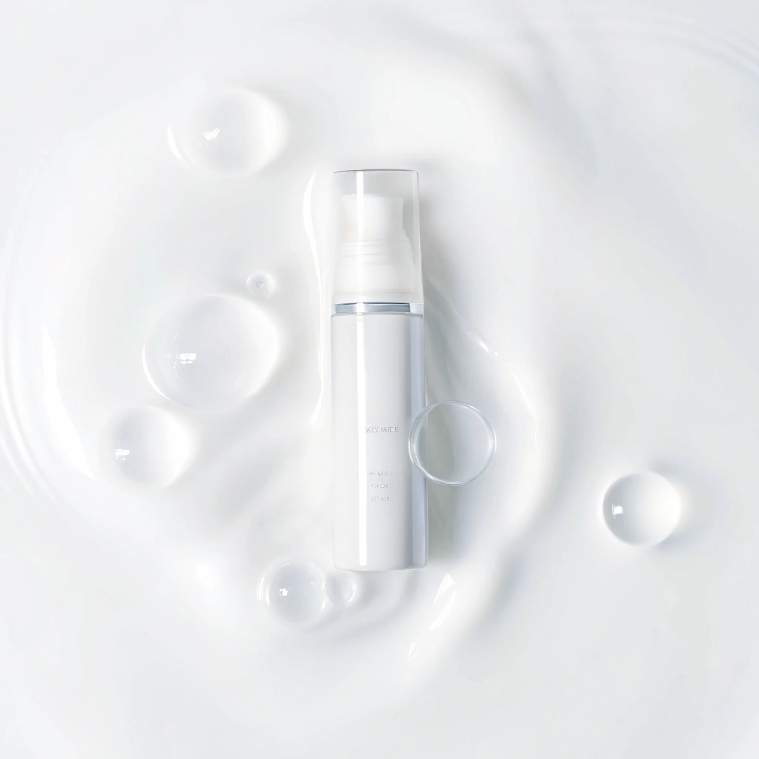 Minimalist white cosmetic bottle on a milky liquid background with bubbles, evoking freshness and hydration in a clean, modern design.