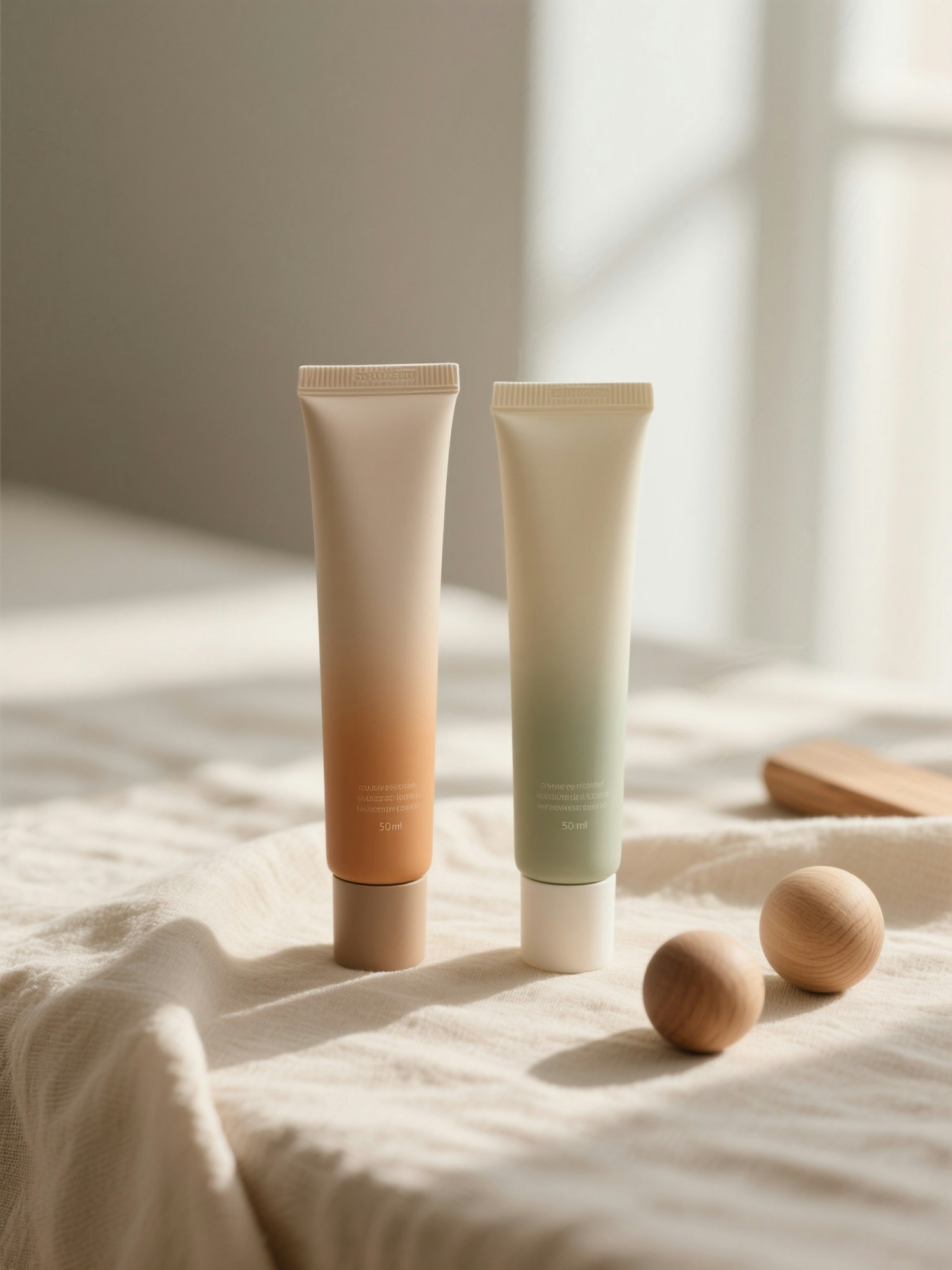 product photo of minimalist skincare packaging in a serene and refined setting, natural light, earthy and calming mood, soft shadows, realistic photography, no label or branding, clean and elegant composition — two squeeze tubes with matte gradient finish (one in beige to amber, the other in sage to cream), standing on a soft textured beige cloth, styled with small wooden props and soft directional lighting
