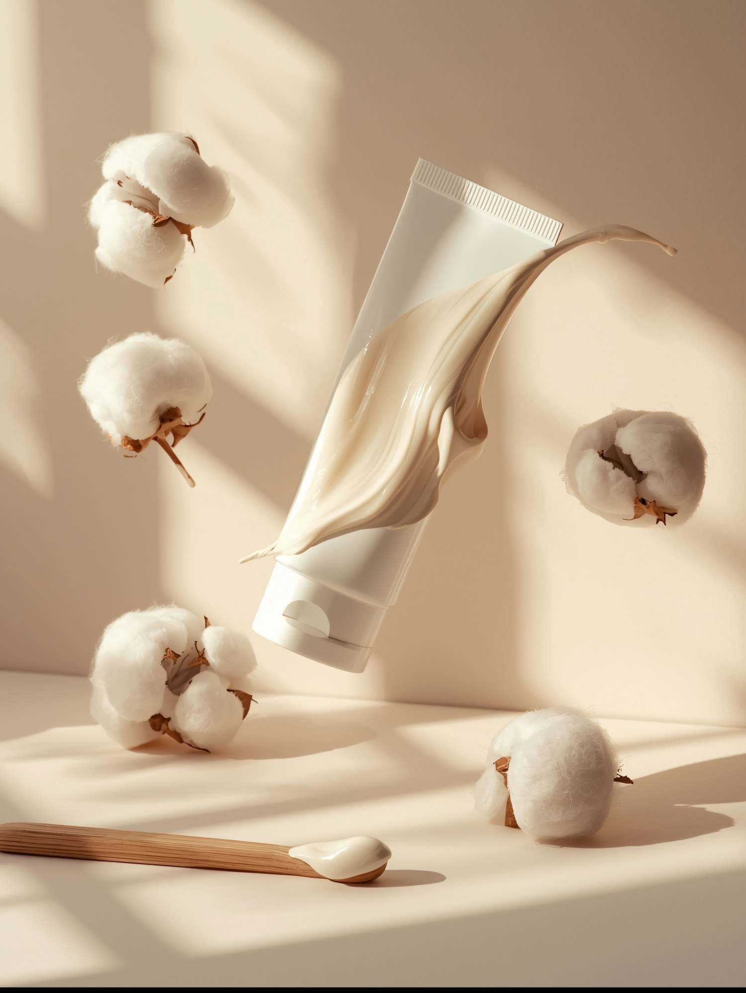 Aesthetic skincare product display with a cream tube, cotton bolls, and a wooden spatula, set in soft natural lighting.