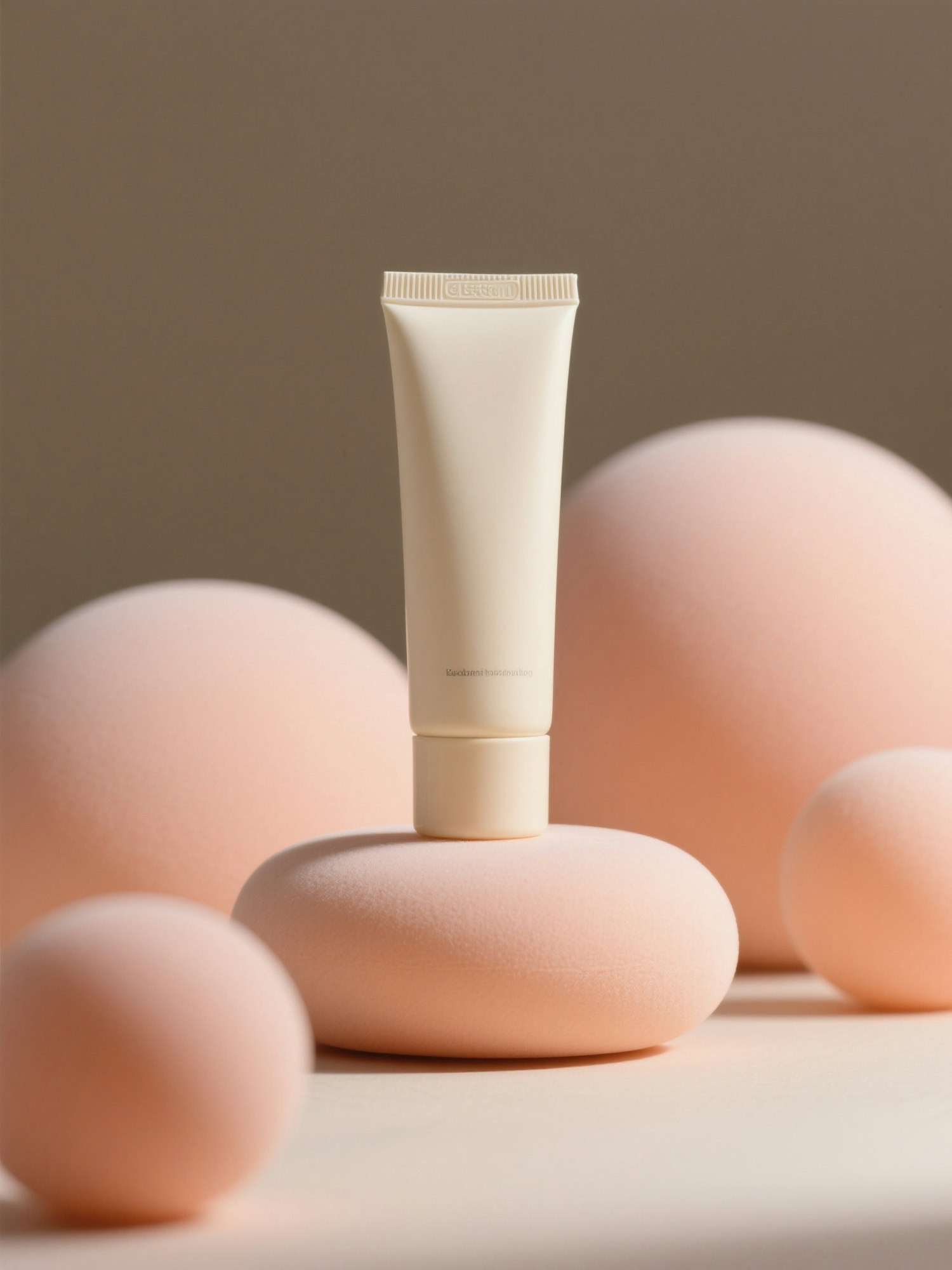 realistic studio photo of a blank cosmetic product with no branding or label, professional lighting, clean shadows, matte soft inflated background shapes, pastel or saturated tones, high detail, sharp focus, natural camera angle, realistic editorial setup — cream-colored tube balanced in inflated peachy-beige soft surfaces