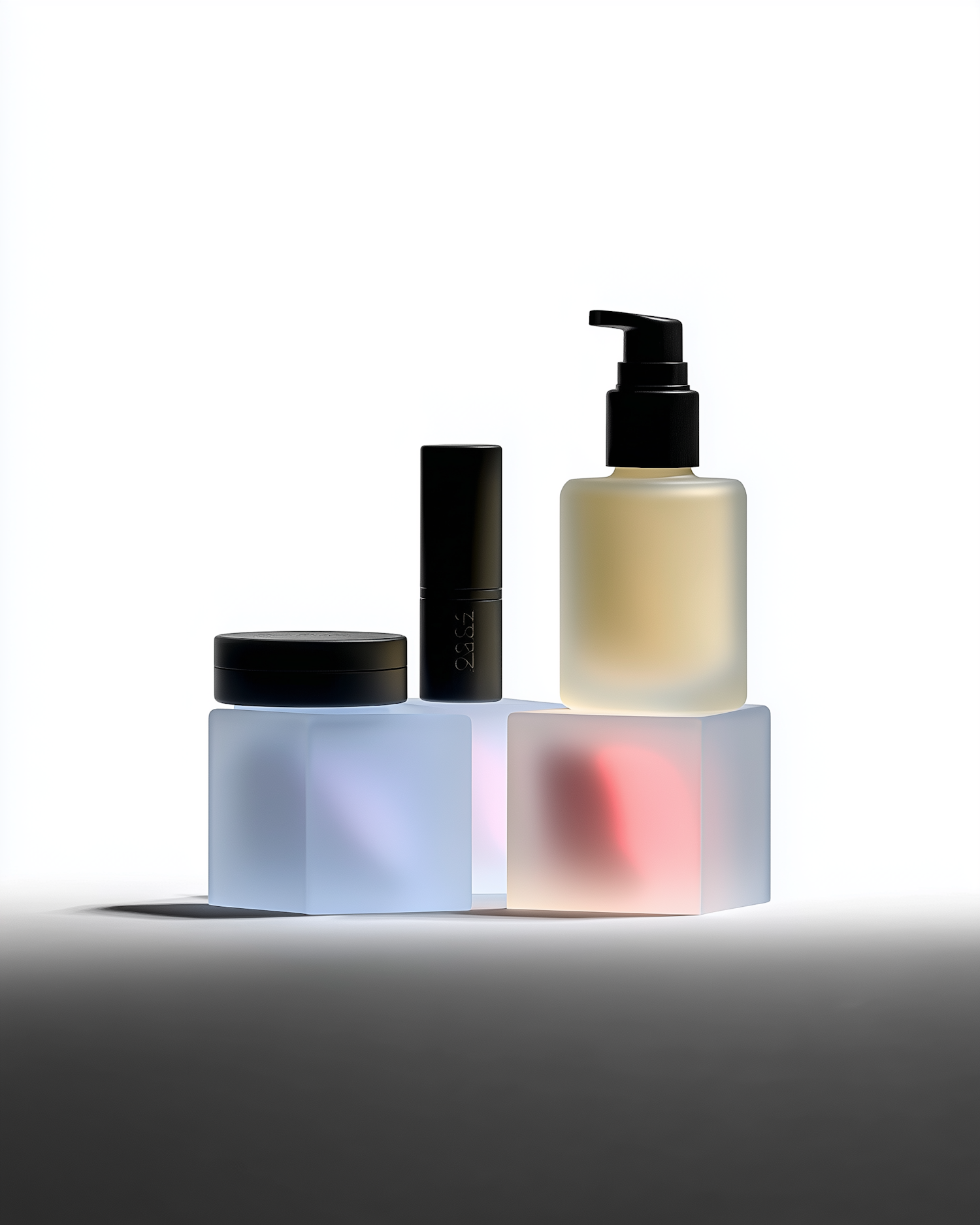 Minimalist cosmetic containers on glowing frosted cubes, featuring a pump bottle, jar, and cylinder in a clean, modern setup.