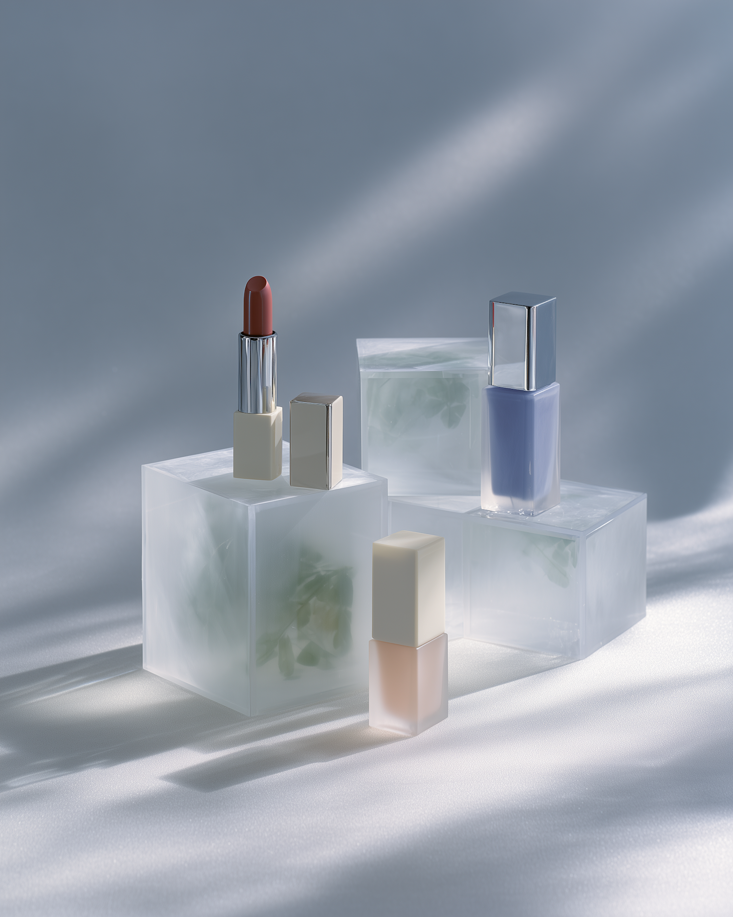Minimalist display of lipstick and nail polish on frosted blocks with soft lighting and a serene blue background.