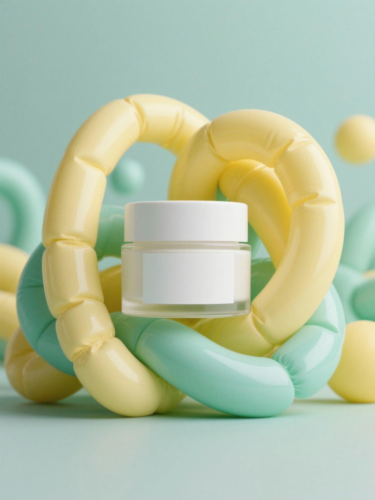 Minimalist cosmetic jar surrounded by pastel yellow and mint green balloon-like shapes on a soft mint background.
