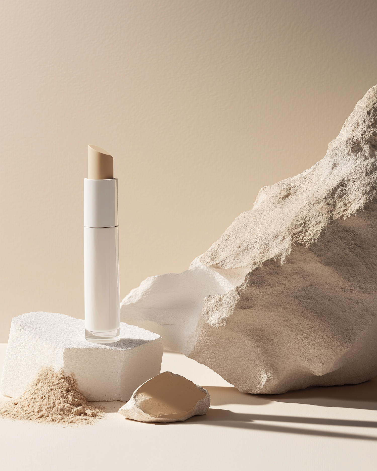 Minimalist cosmetic bottle with beige product, surrounded by stones and powder on a neutral background.