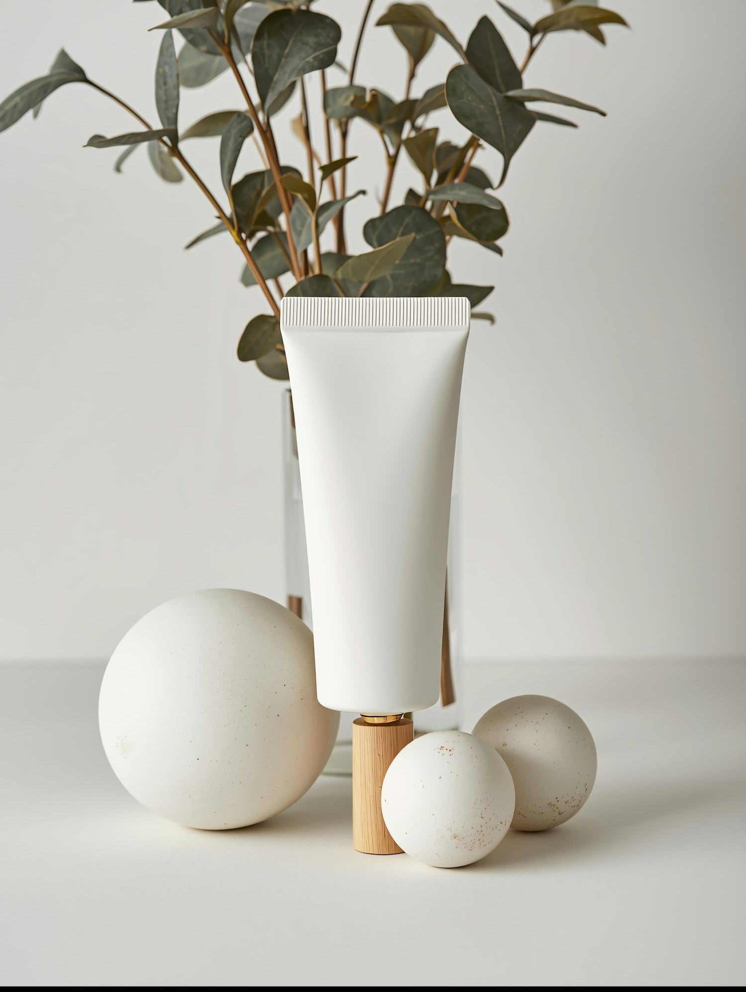 Minimalist skincare product display with a white tube, wooden cap, and eucalyptus leaves in a clean, neutral setting.