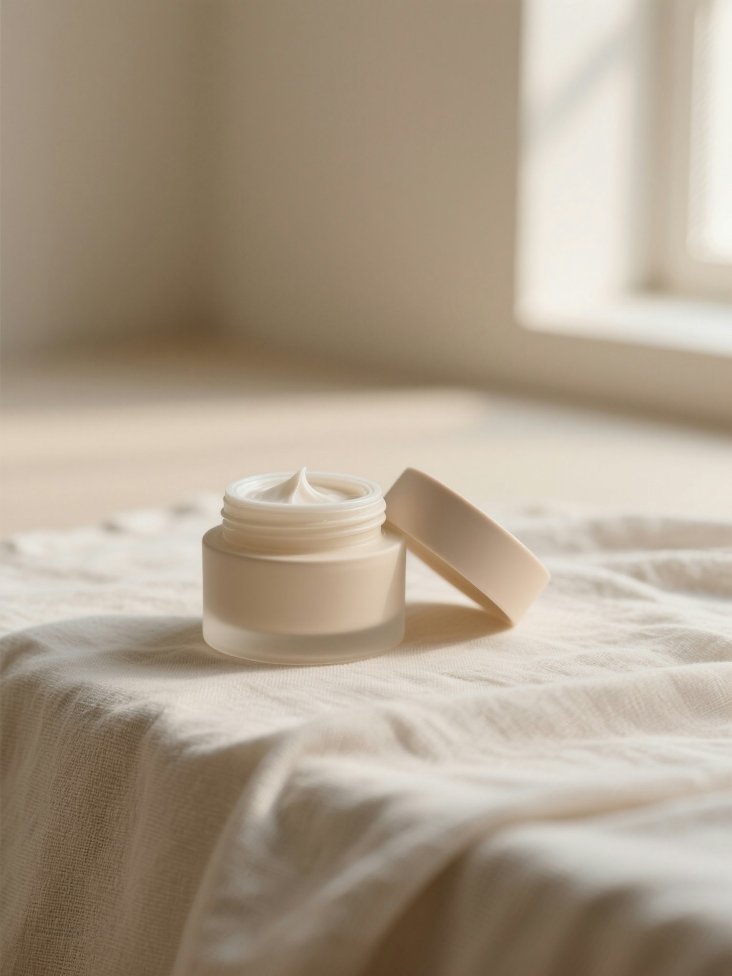 A frosted glass jar of cream with a beige lid sits open on soft fabric, bathed in warm natural light from a nearby window.