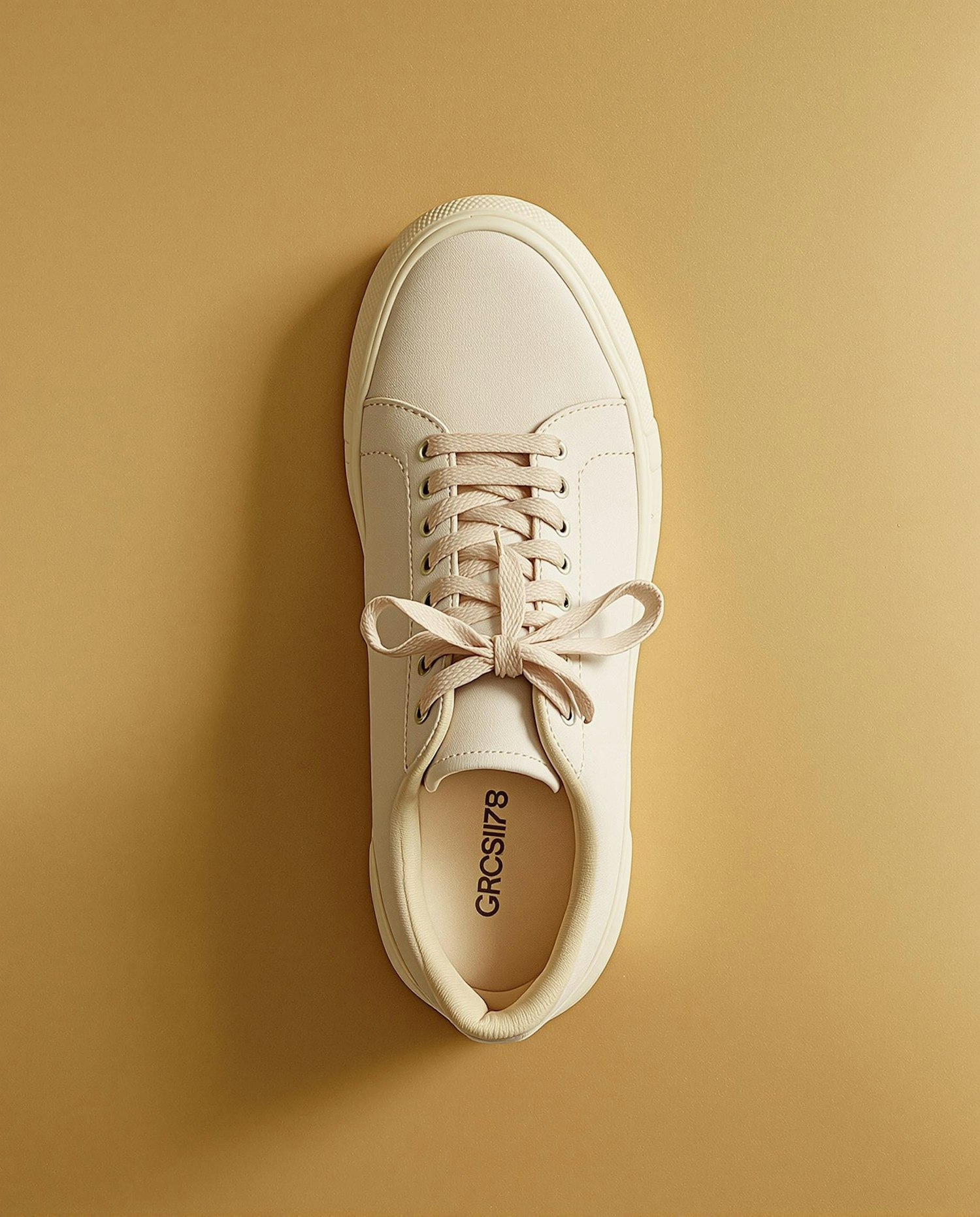 Minimalist cream sneaker with tonal laces and branding on the insole, set against a beige background for a clean, modern look.