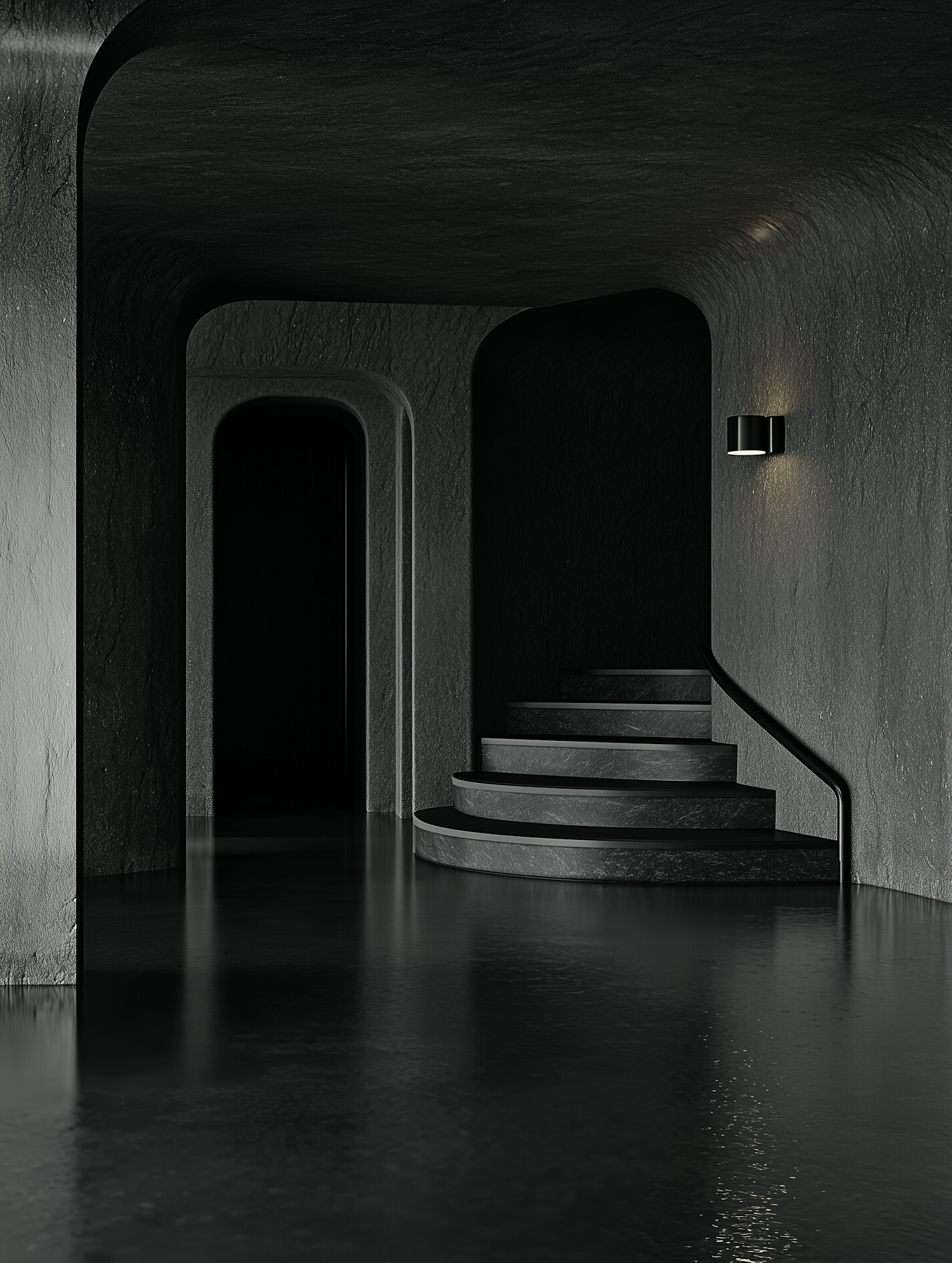 Dimly lit modern interior with curved staircase, dark polished surfaces, and sleek wall sconce creating a serene, mysterious atmosphere.