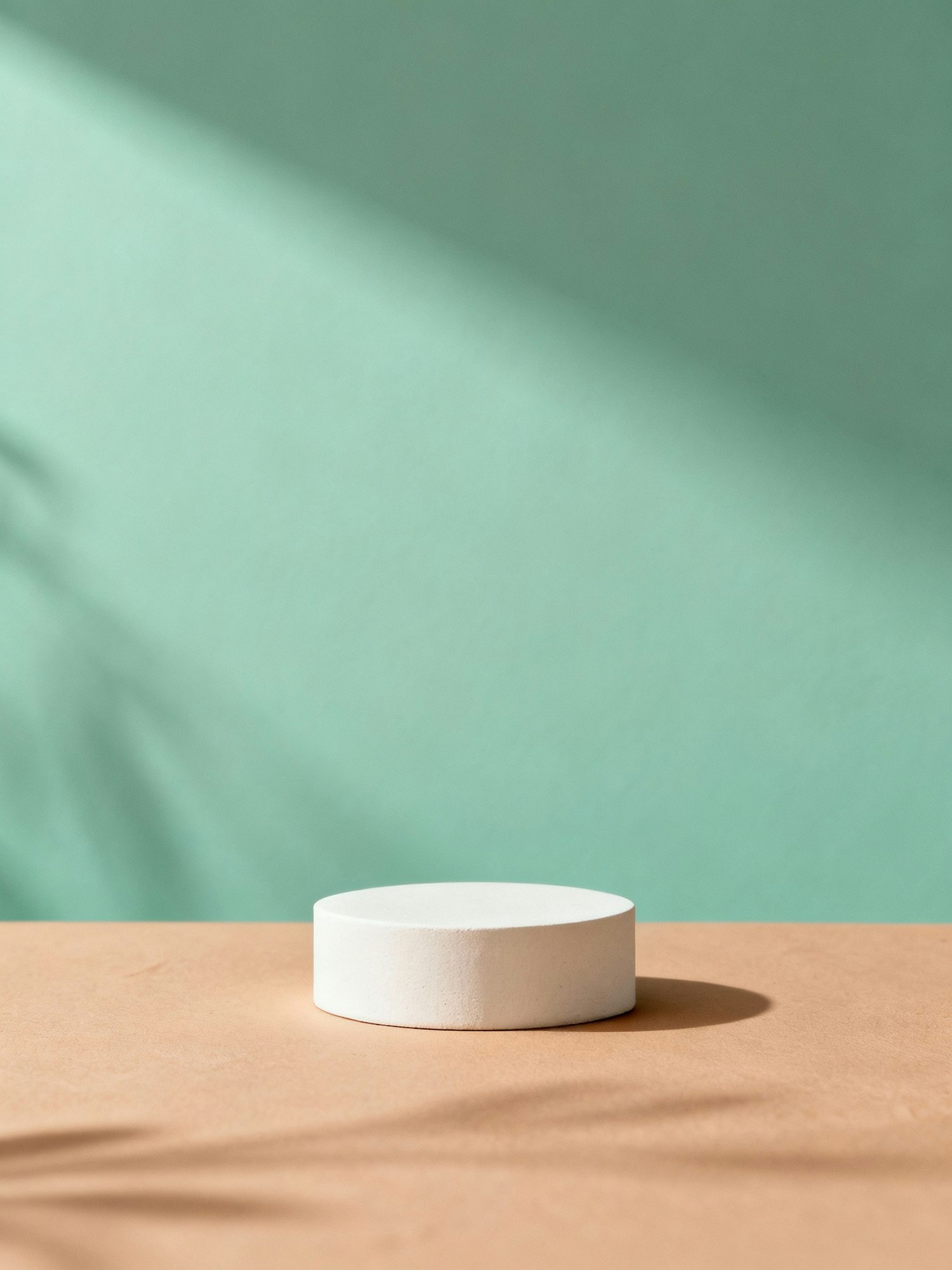 Minimalist setup with a white cylinder on a beige surface against a green background, featuring soft shadows and a clean aesthetic.