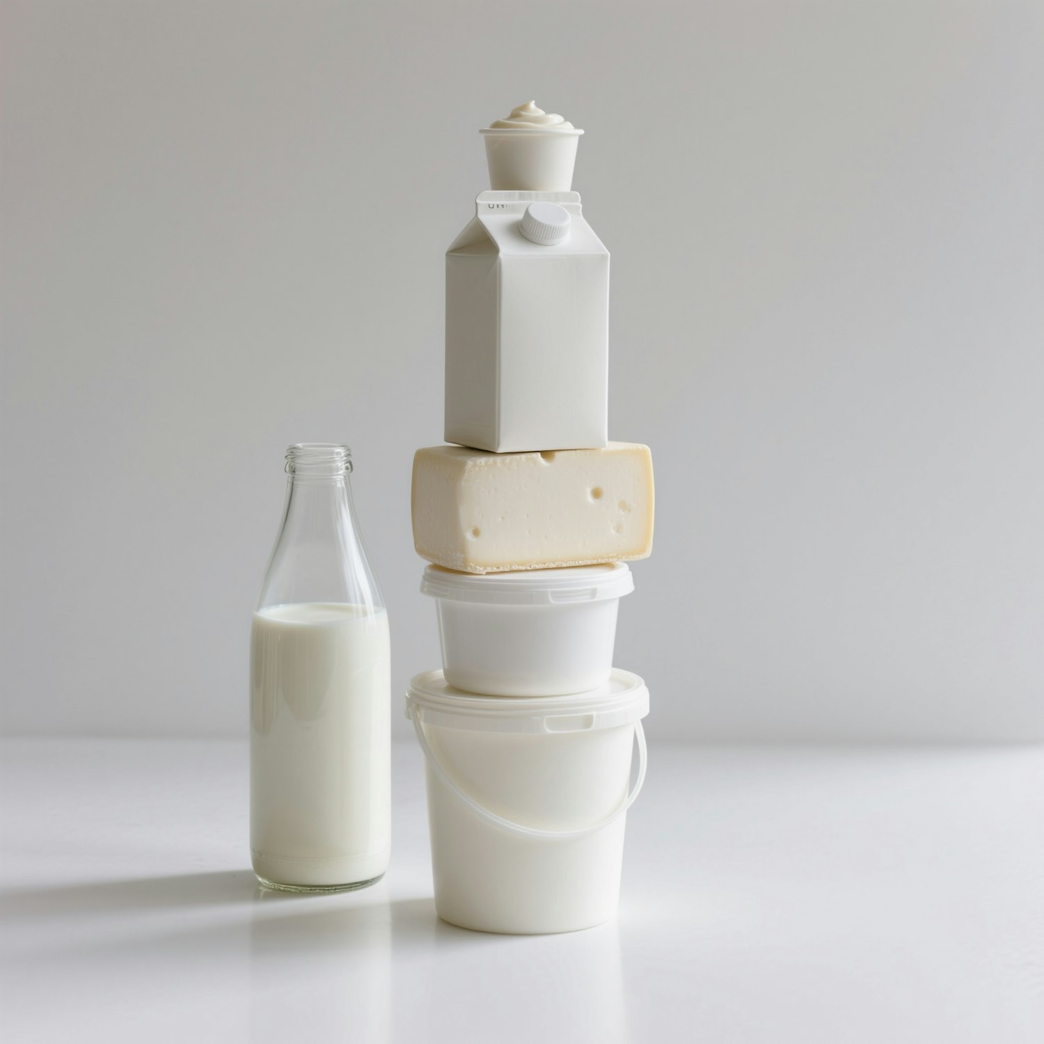 A photorealistic stack of plain dairy products, including a classic glass milk bottle at the bottom, a long-life (UHT) milk carton, a rectangular white cheese tub (not a cheese block), a round yogurt bucket, and a small breakfast cream cup. All packages are in neutral white or off-white colors with absolutely no logos, text, or labels. The dairy items are artistically stacked directly on top of each other, inspired by balanced rocks, but with no stone or extra non-dairy elements—just the dairy products themselves. Pure white background, no shadows or reflections. The camera angle is front with a slight top-down view, minimal studio lighting, crisp and clean look, ultra-realistic.