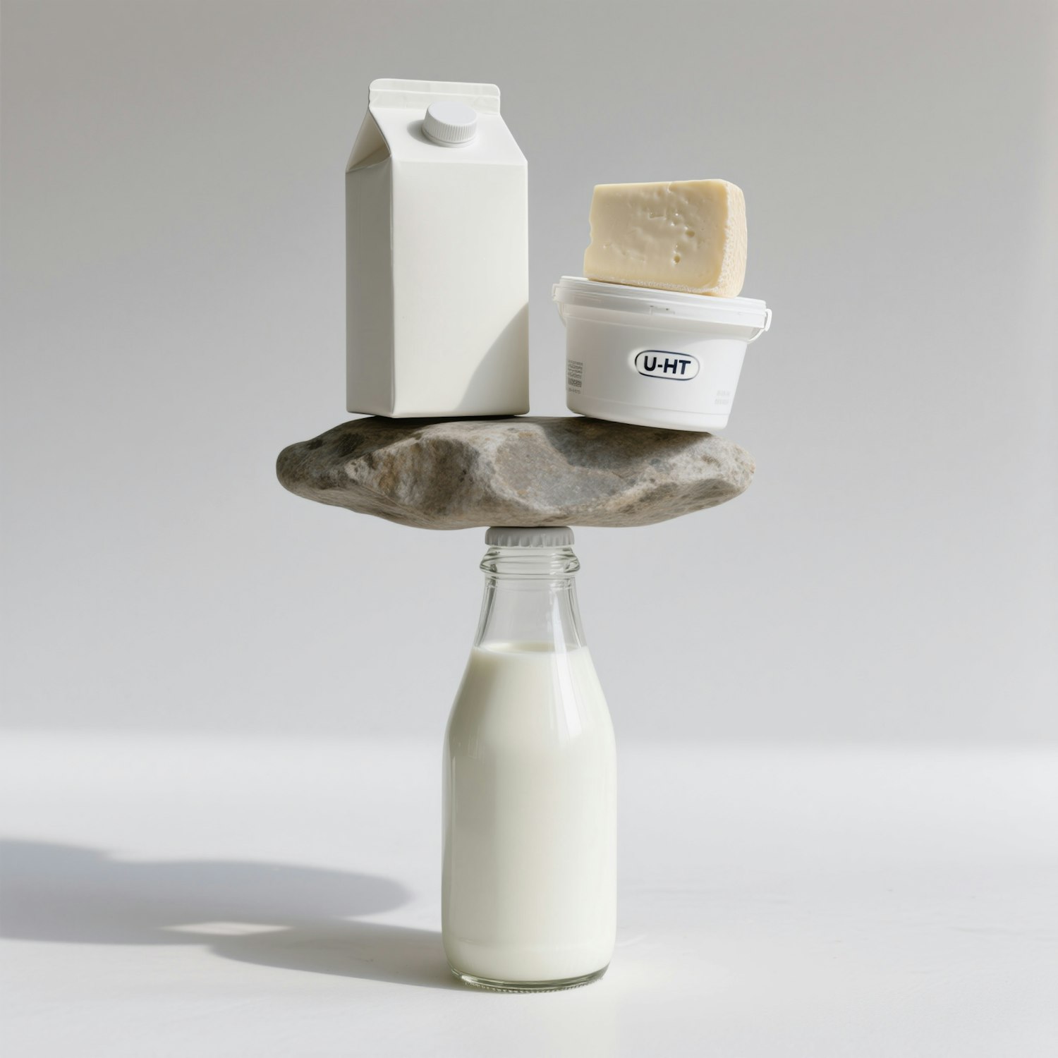 Minimalist dairy product arrangement with milk, cream, and cheese balanced on a stone, creating a clean and artistic composition.