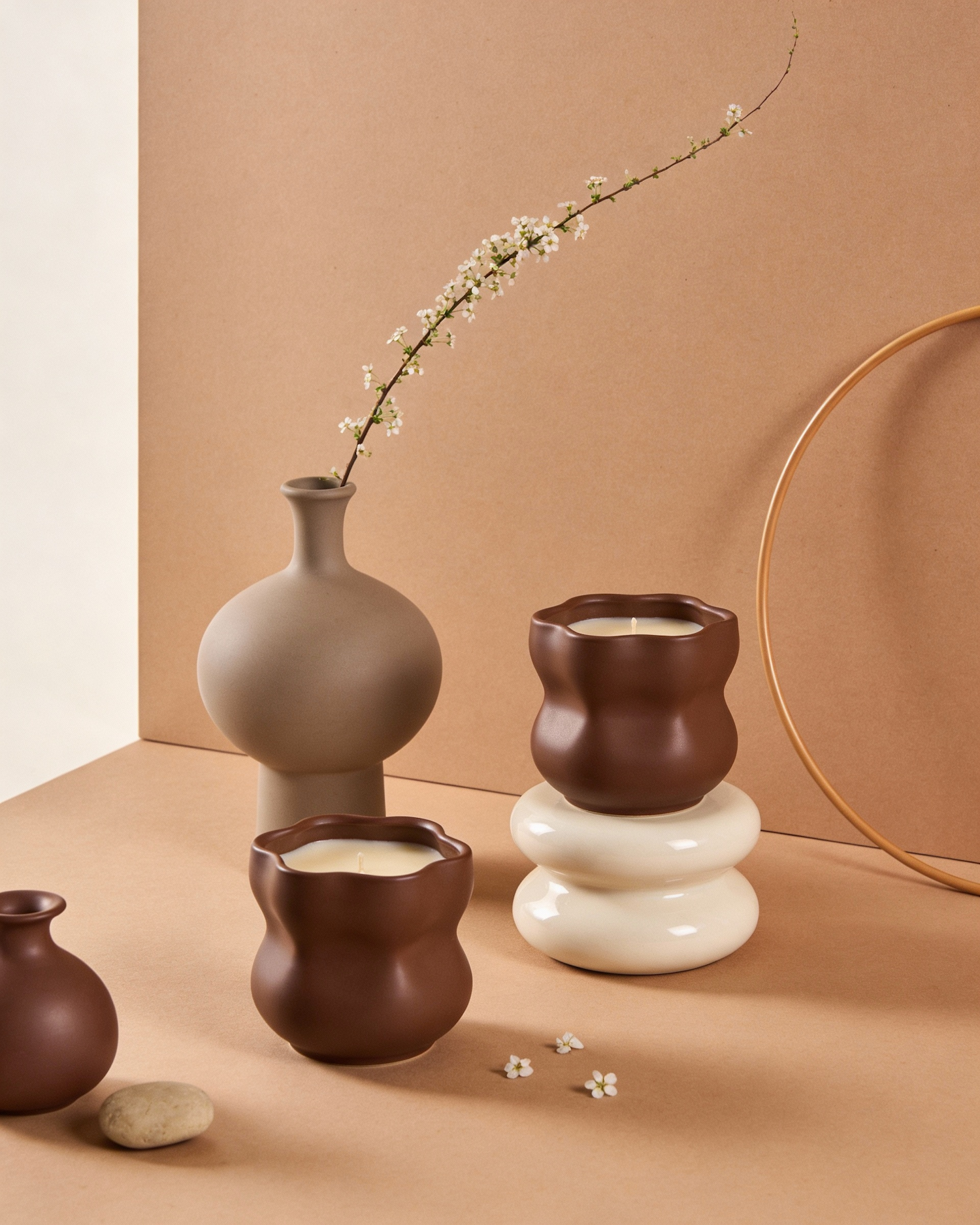 Minimalist decor with vases, candles, and natural elements in earthy tones, creating a serene and balanced aesthetic.