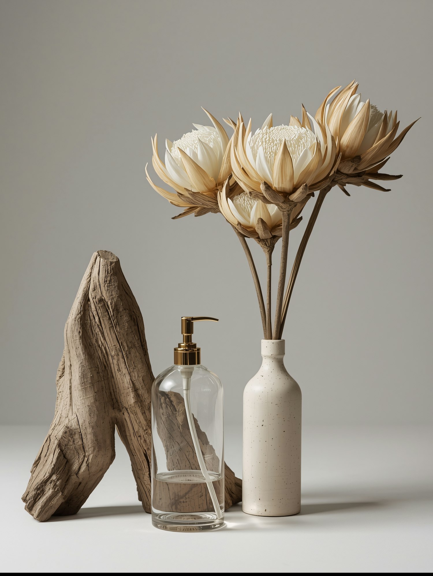 Minimalist decor with a glass soap dispenser, dried protea flowers in a ceramic vase, and driftwood on a neutral background.