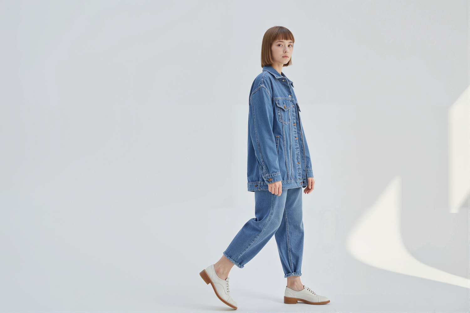 Young woman in oversized denim jacket and pants, standing in a minimalist setting with soft lighting and a neutral expression.