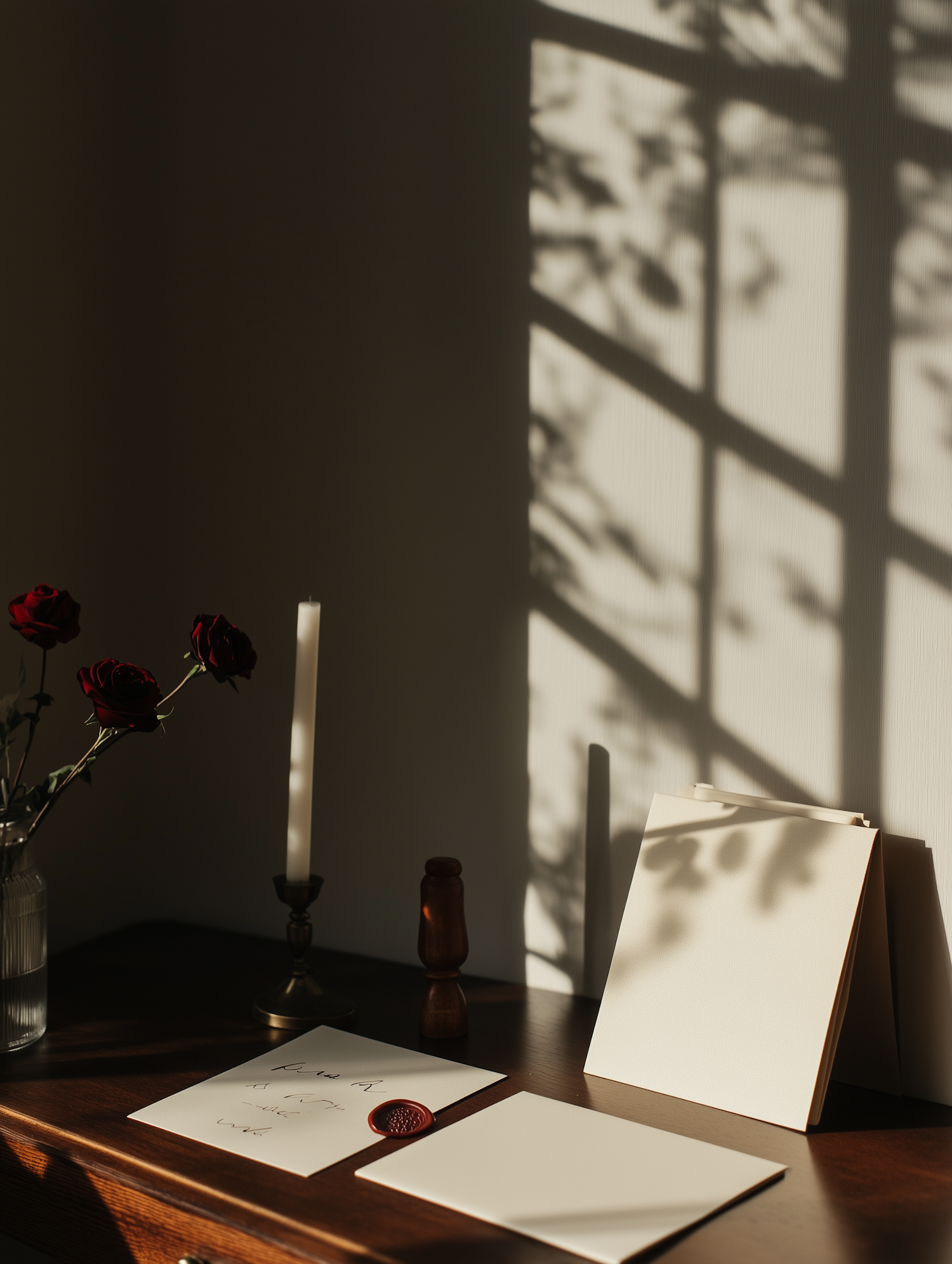 Minimalist desk setup with red roses, a candle, and wax-sealed letters in warm sunlight and leafy shadows.