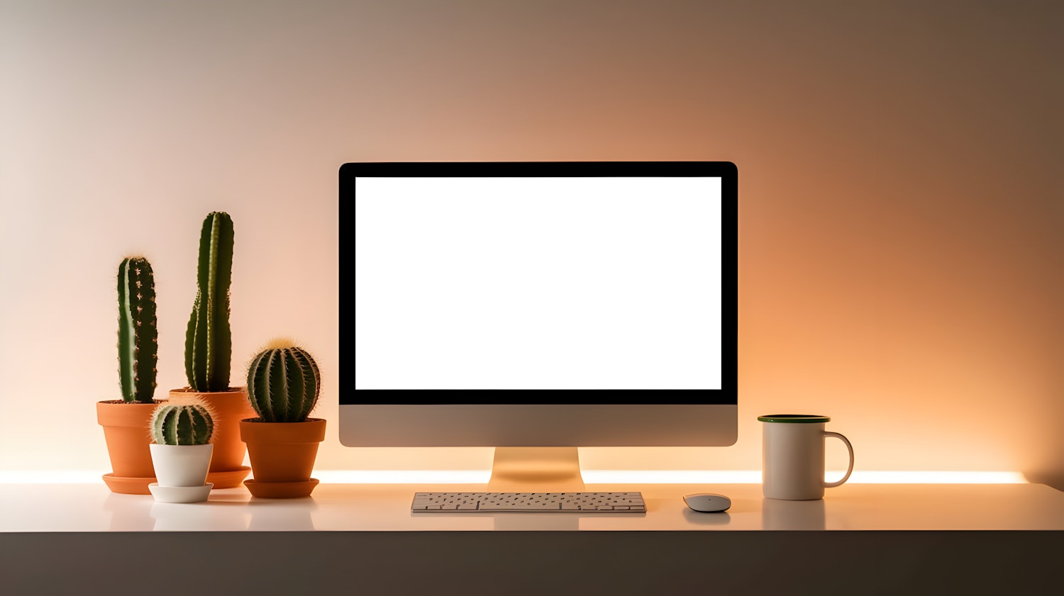 Minimalist desk setup with a computer, potted cacti, and a white mug under warm ambient lighting.