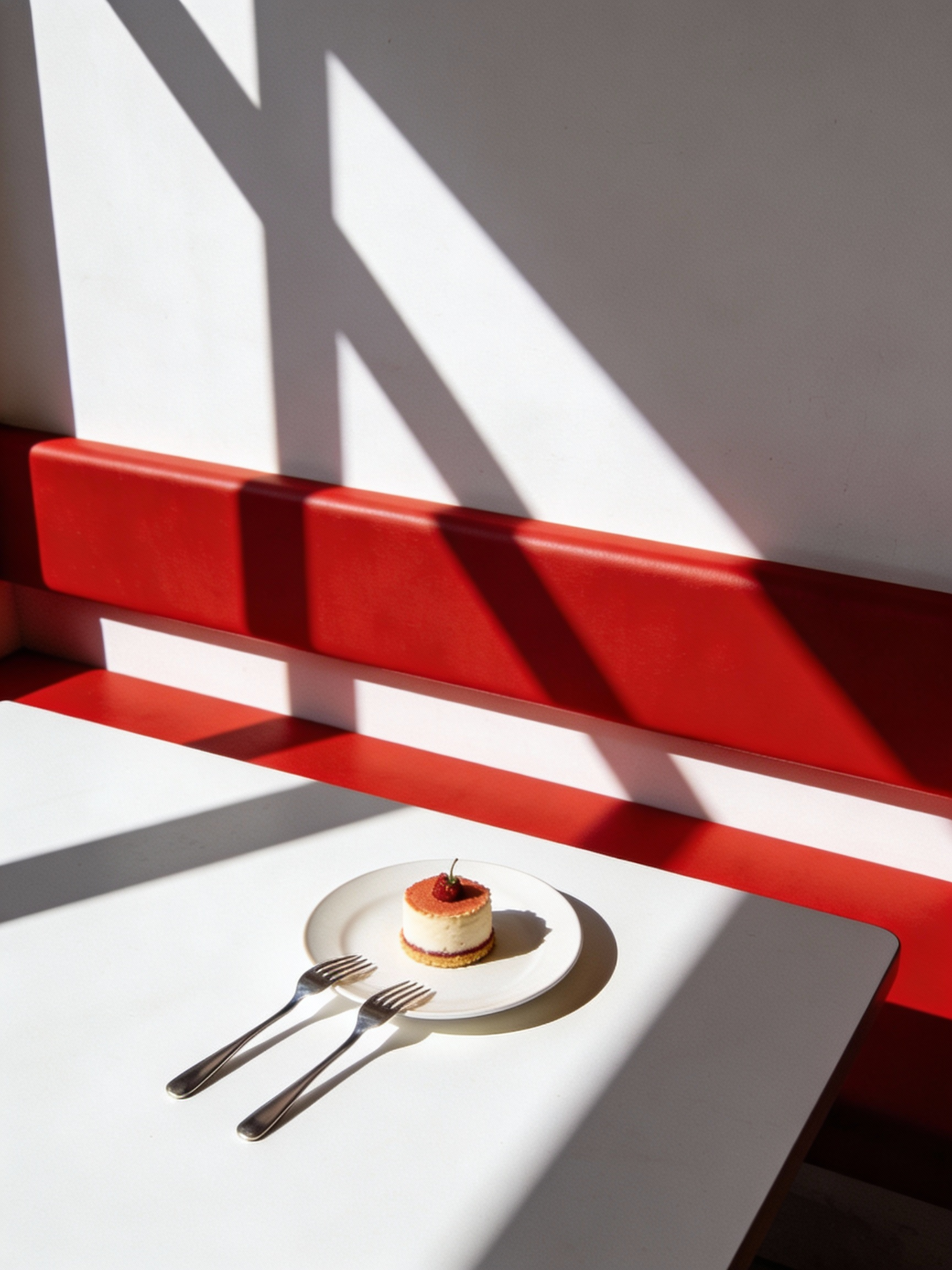 A minimalist dessert scene with a cherry-topped cake on a white plate, set against a red bench and dramatic shadows.