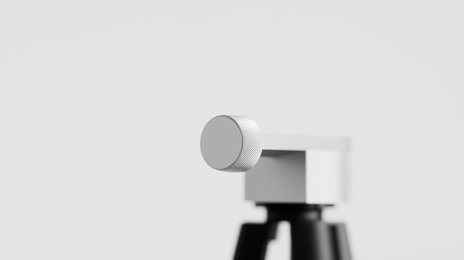 Minimalistic close-up of a textured metallic knob on a white structure, mounted on a black base, against a neutral gray background.