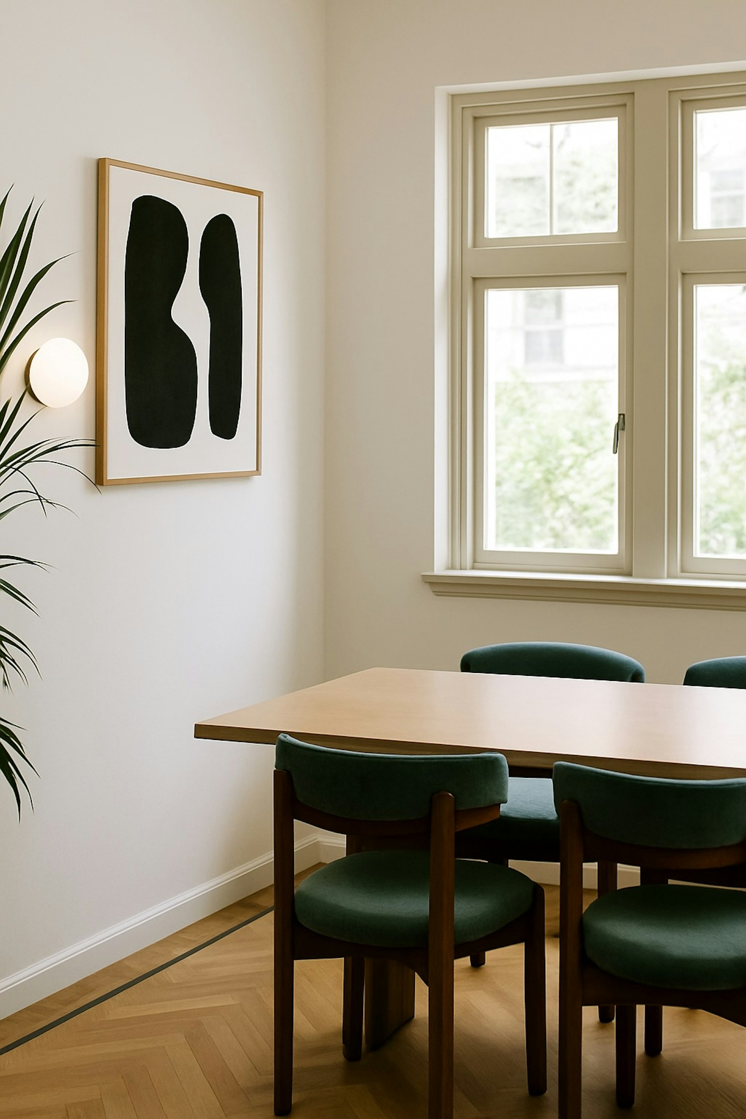 Minimalist dining area with a wooden table, green chairs, abstract art, and natural light from a large window.