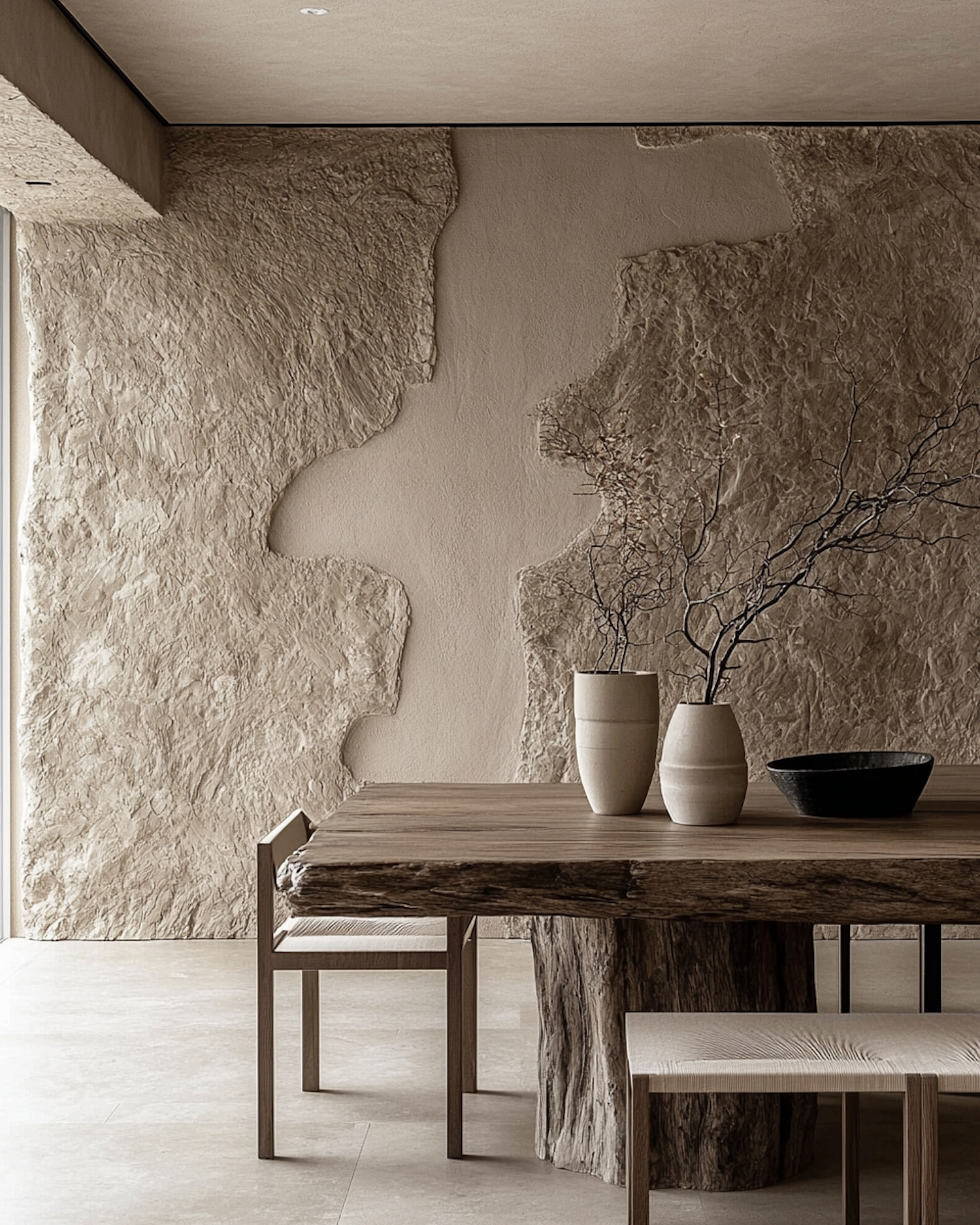 Rustic dining area with a tree trunk table, textured walls, and minimalist decor in warm, earthy tones. Perfect for a natural aesthetic.