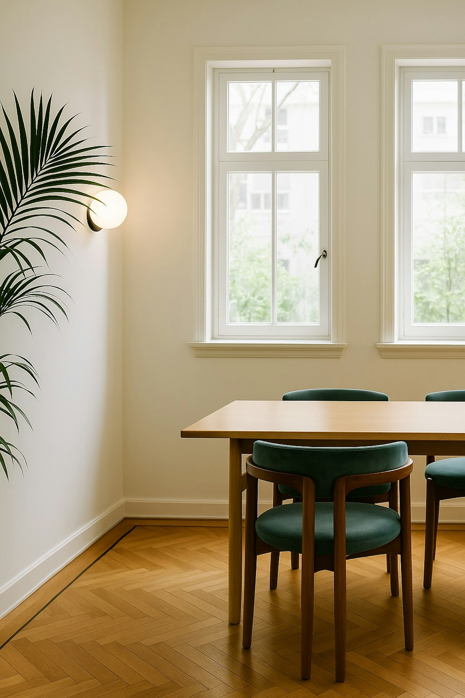 Minimalist dining area with a wooden table, green chairs, herringbone floor, and large windows letting in natural light.
