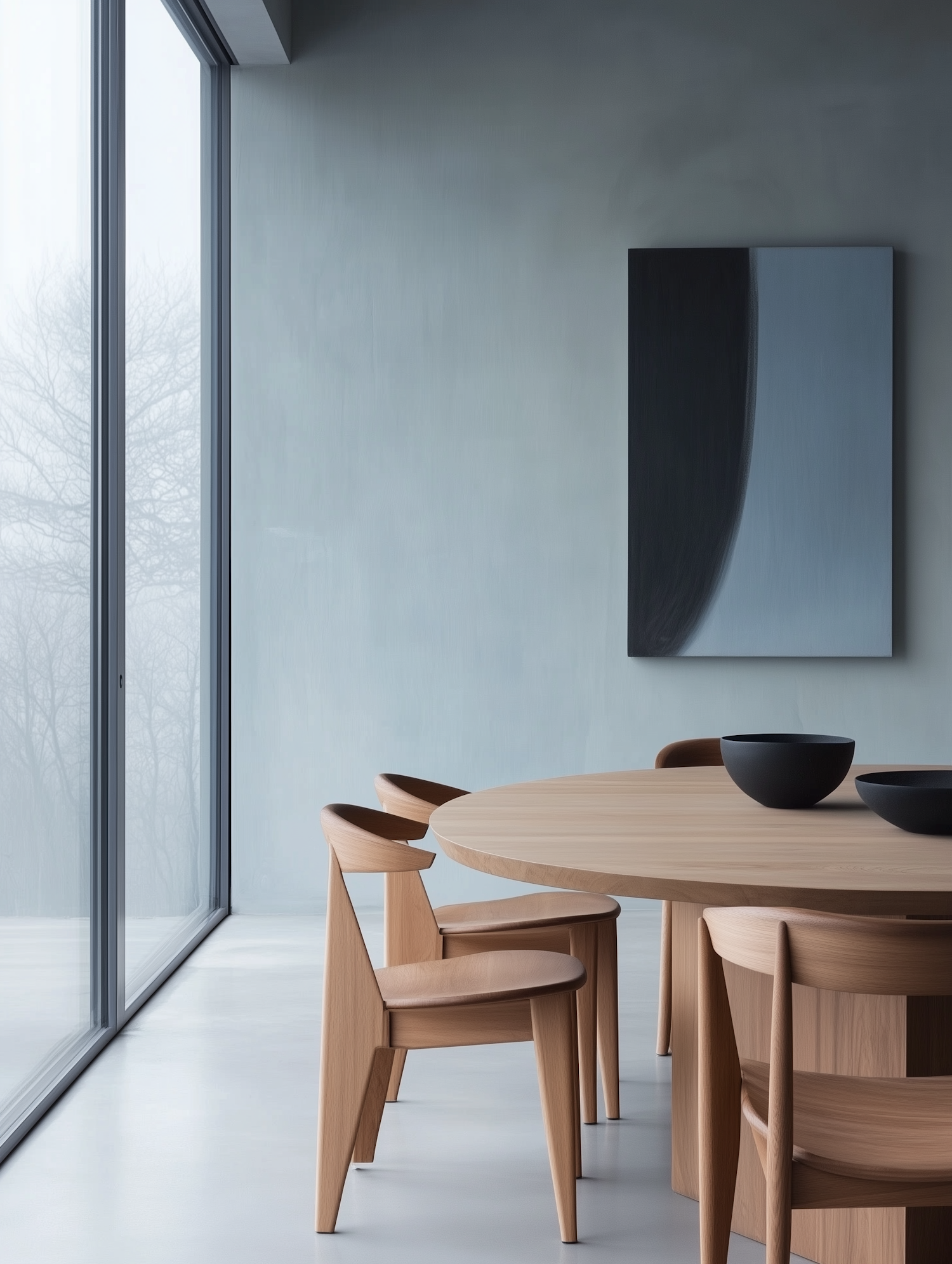Modern dining setting with sleek wooden furniture, large windows, soft gray walls, and minimalist decor accented by black ceramics.