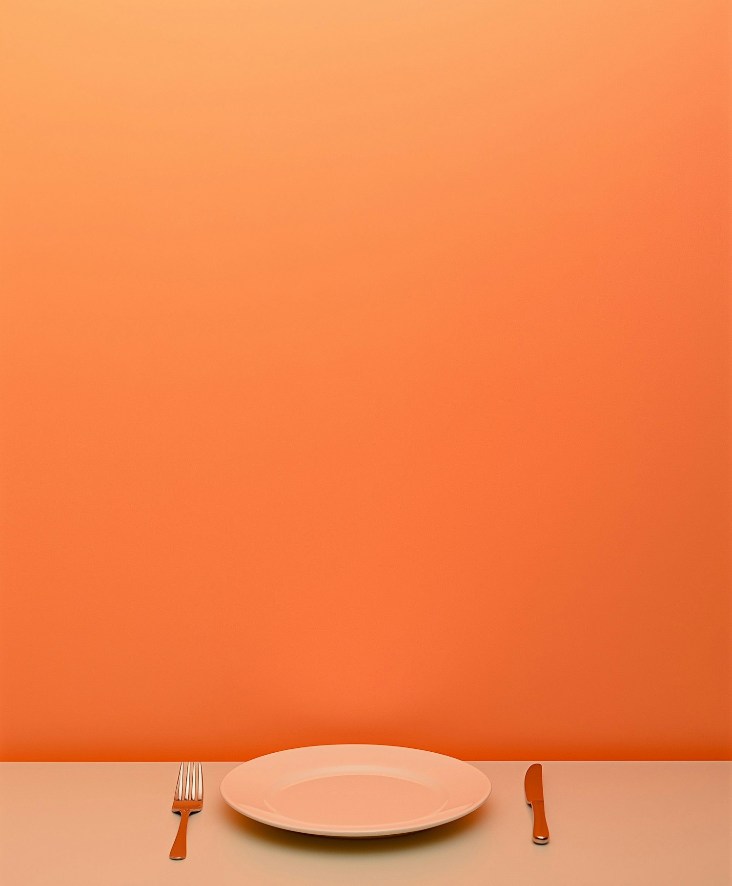 Minimalist dining setup with a white plate, fork, and knife against a vibrant orange background, emphasizing modern elegance.