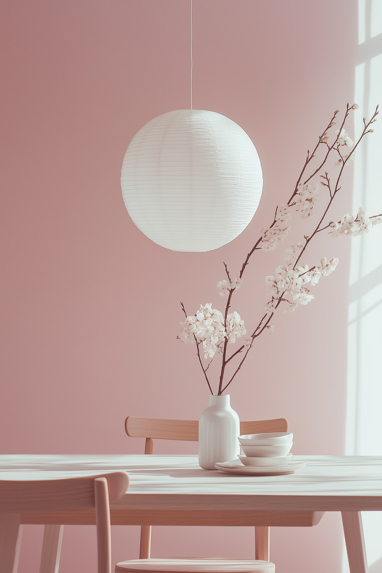 Minimalist dining setup with cherry blossoms in a white vase, soft pink background, and a white paper lantern for a serene aesthetic.