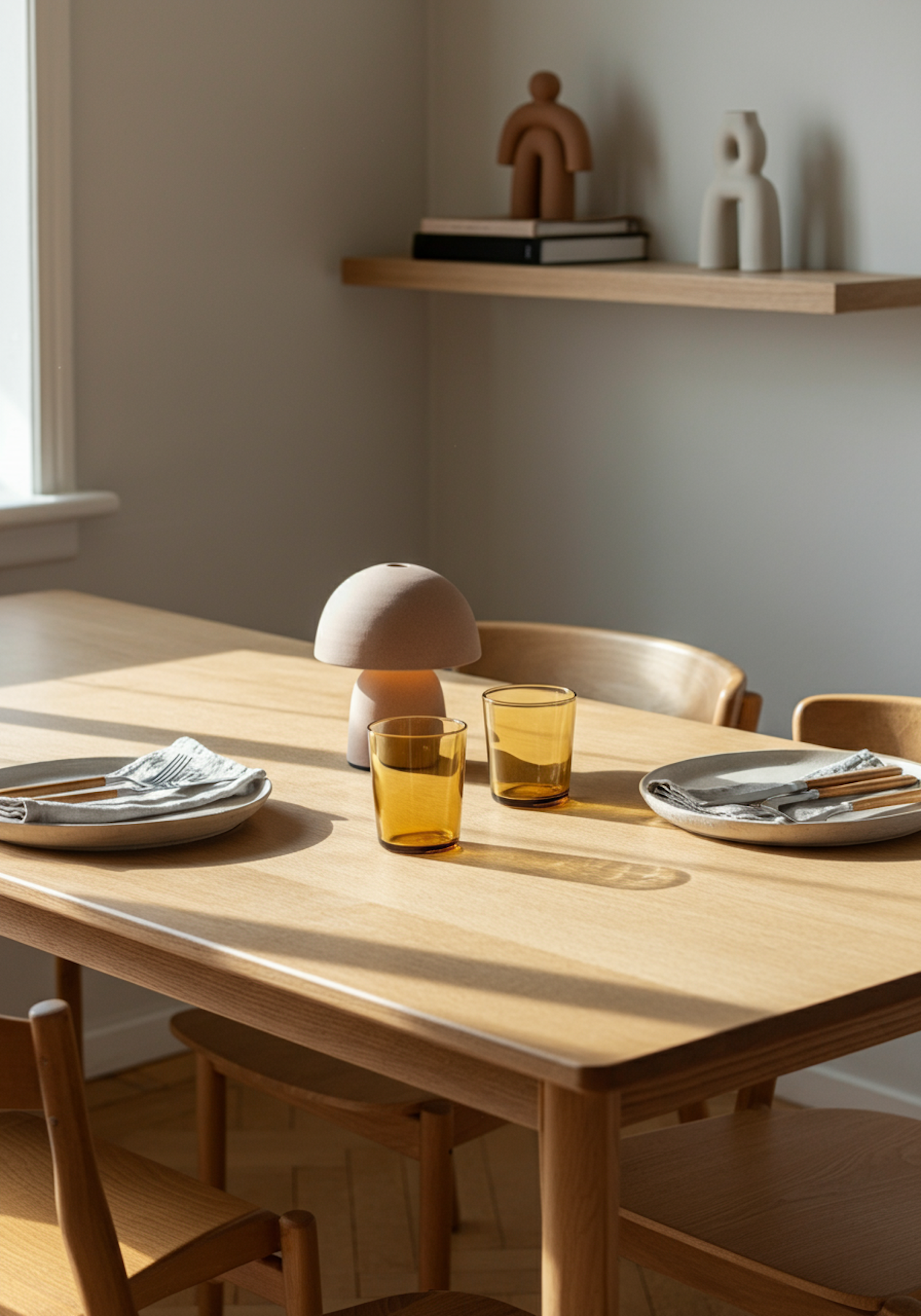 Minimalist dining table with amber glasses, plates, and a mushroom lamp. Sunlight and modern decor create a cozy, stylish vibe.