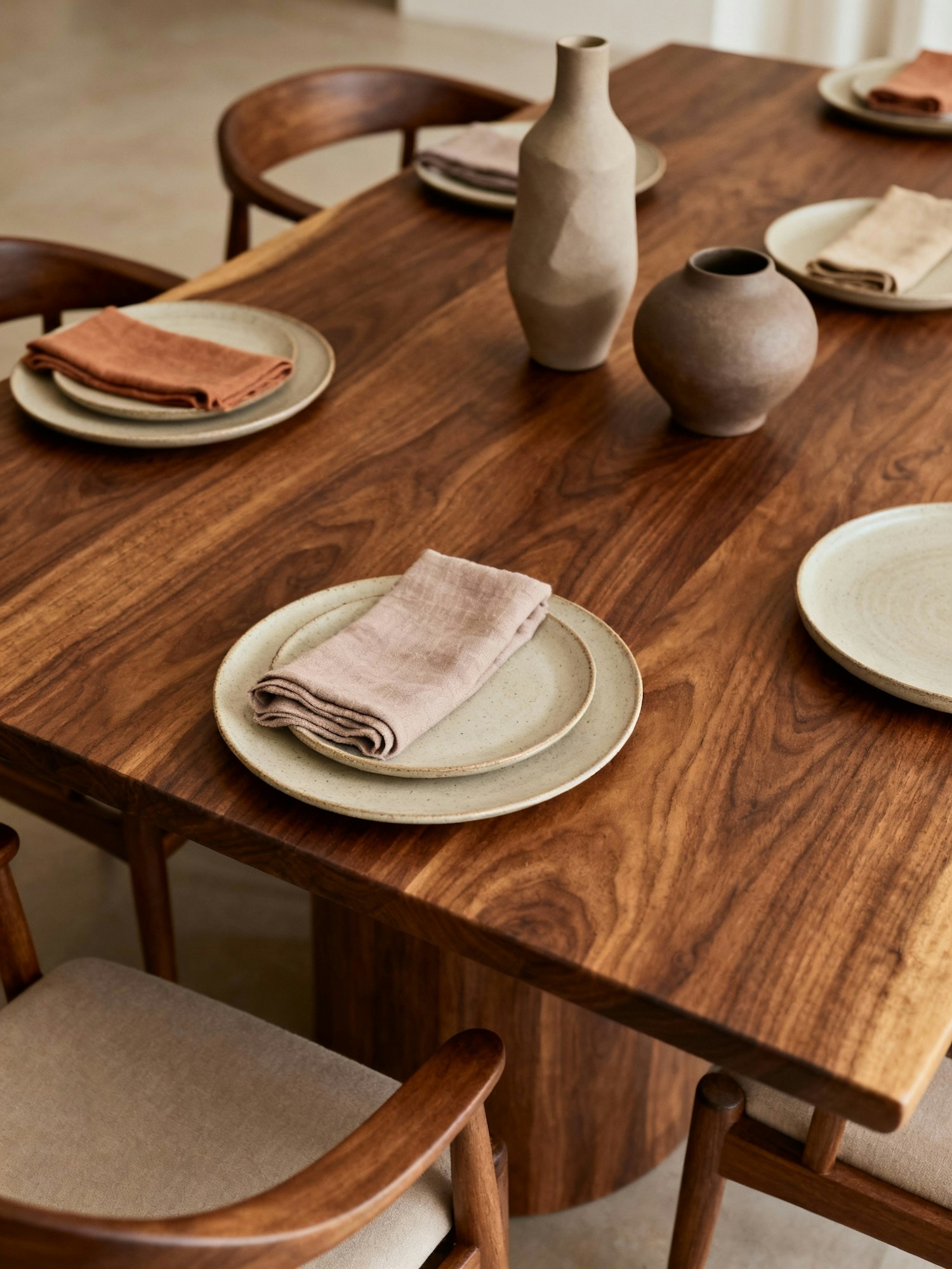 A wooden dining table set with ceramic plates, cloth napkins, and vases, showcasing a minimalist and natural aesthetic.