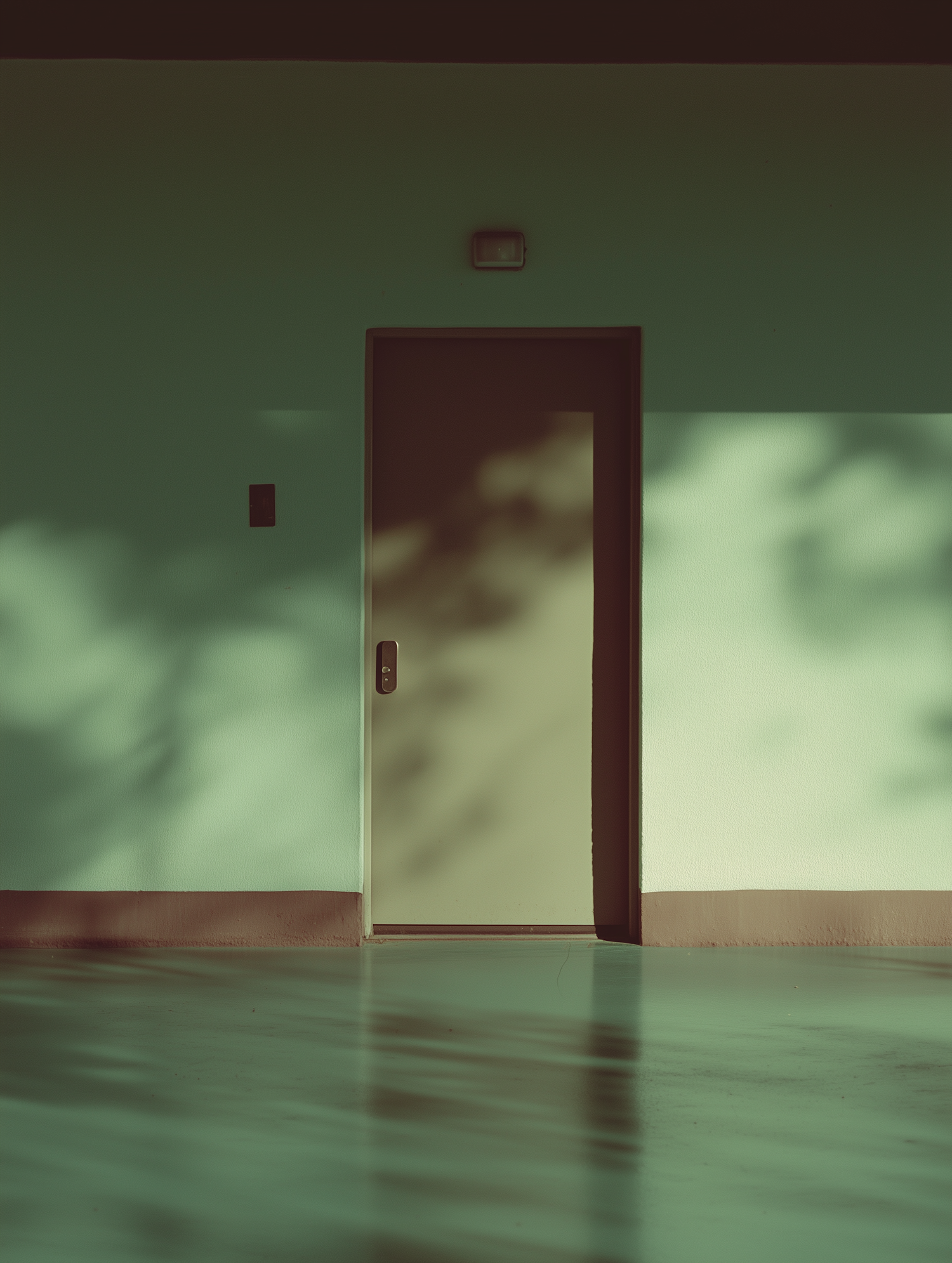 Minimalist green wall with a closed door, soft shadows, and a polished floor reflecting natural light.