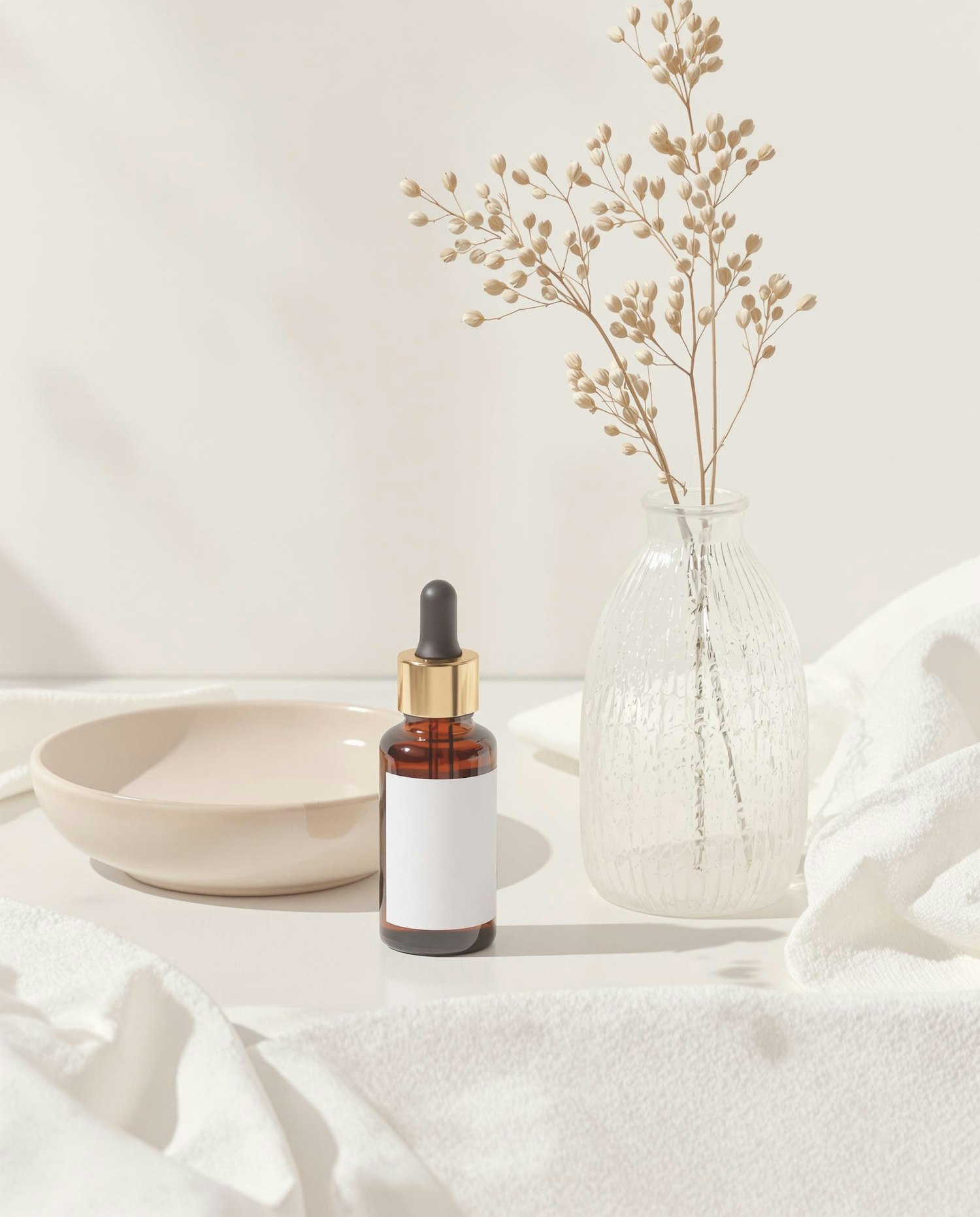 Minimal aesthetic with a brown glass dropper bottle and dried florals on a white backdrop, evoking simplicity and elegance.