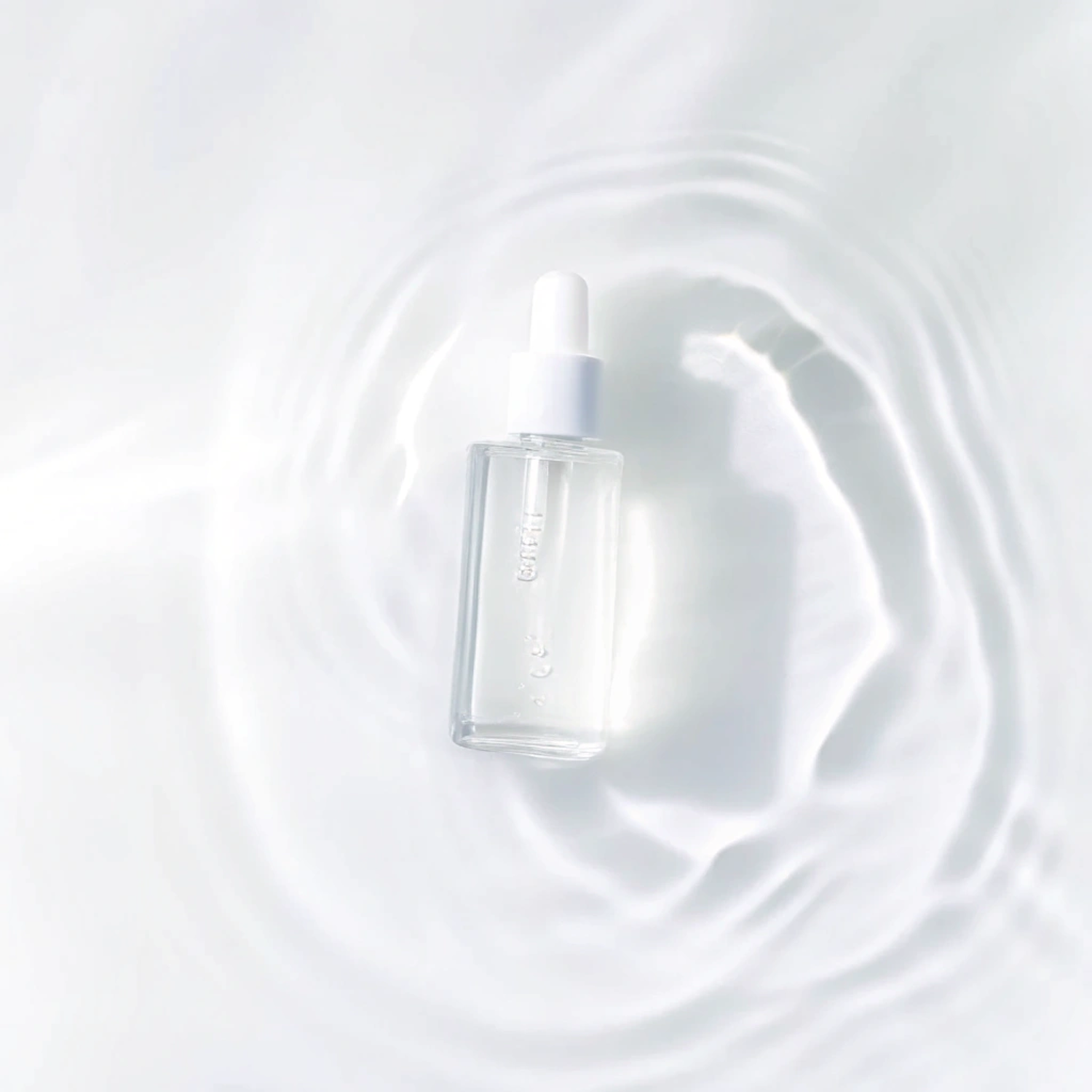 Minimalist clear dropper bottle on rippling white surface, perfect for skincare or beauty product branding with a clean, fresh vibe.