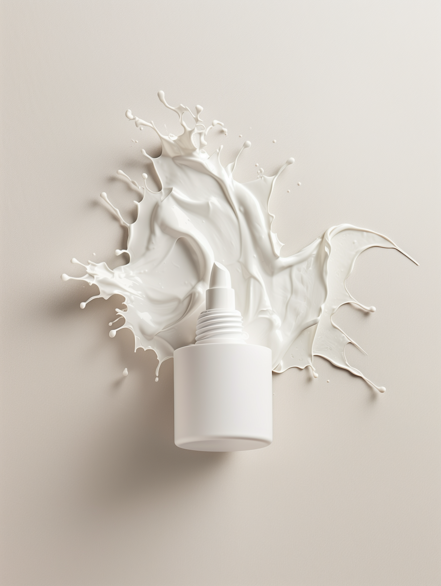 A white dropper bottle amidst an artistic burst of cream or paint, set against a textured, neutral background for a stunning visual.