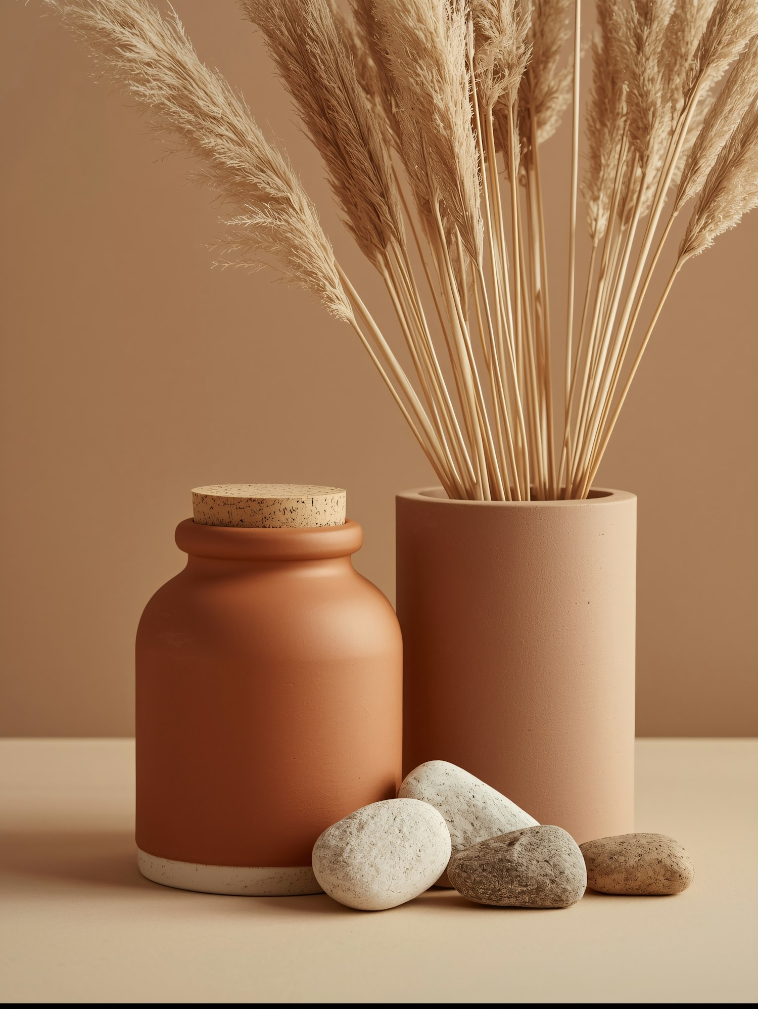 Minimalist decor with a terracotta jar, pampas grass in a vase, and smooth stones on a beige background. Perfect for earthy vibes.