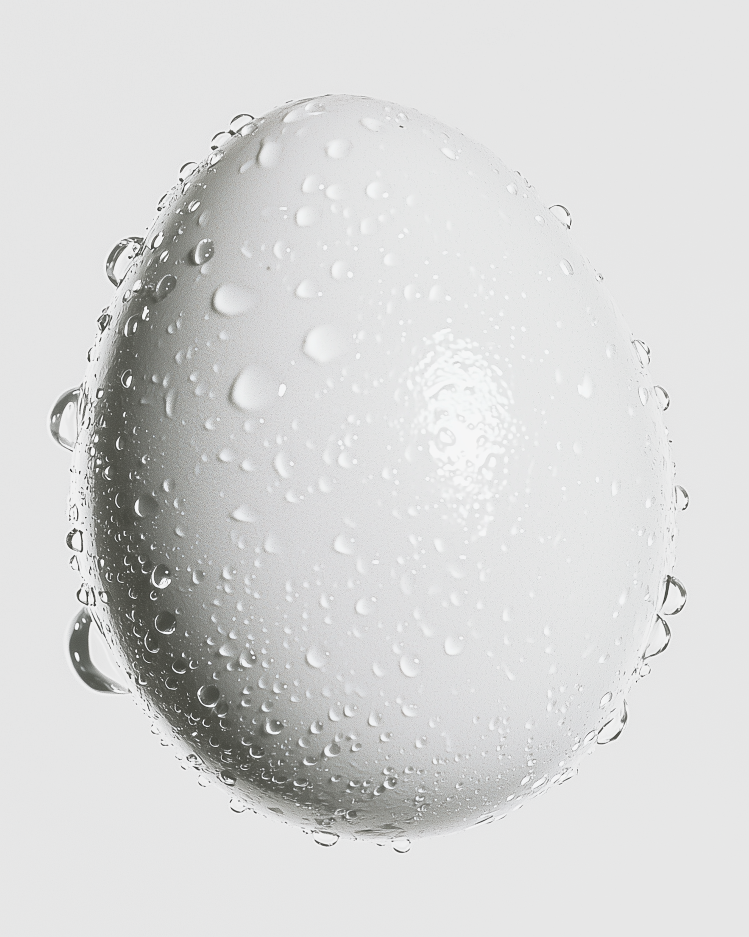 A close-up of a white egg with water droplets on a light gray background, showcasing texture and minimalism.