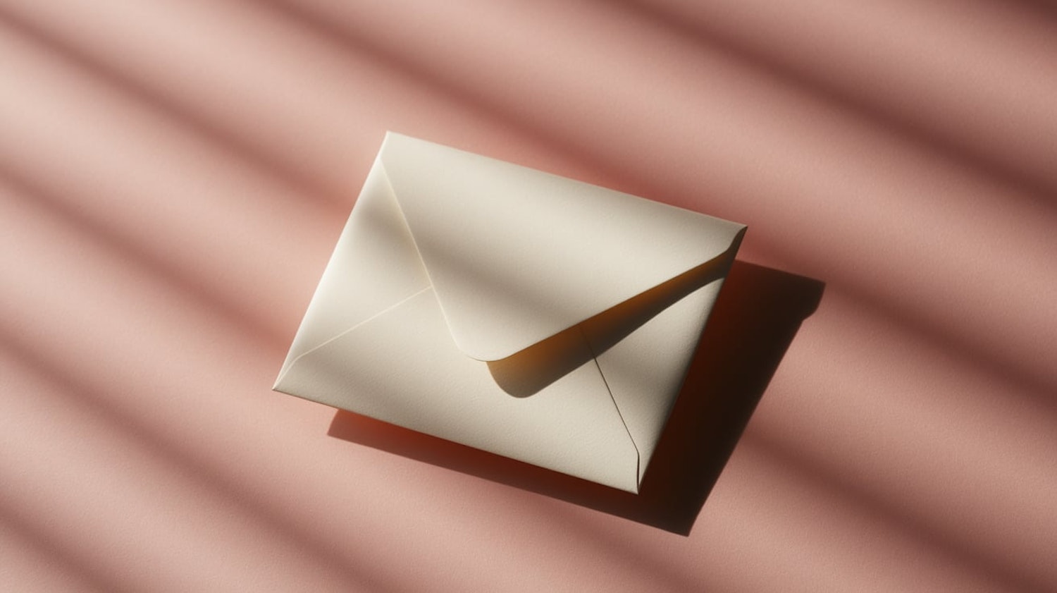 Minimalist cream envelope on a pink surface with warm light and diagonal shadows, creating a soft and elegant aesthetic.