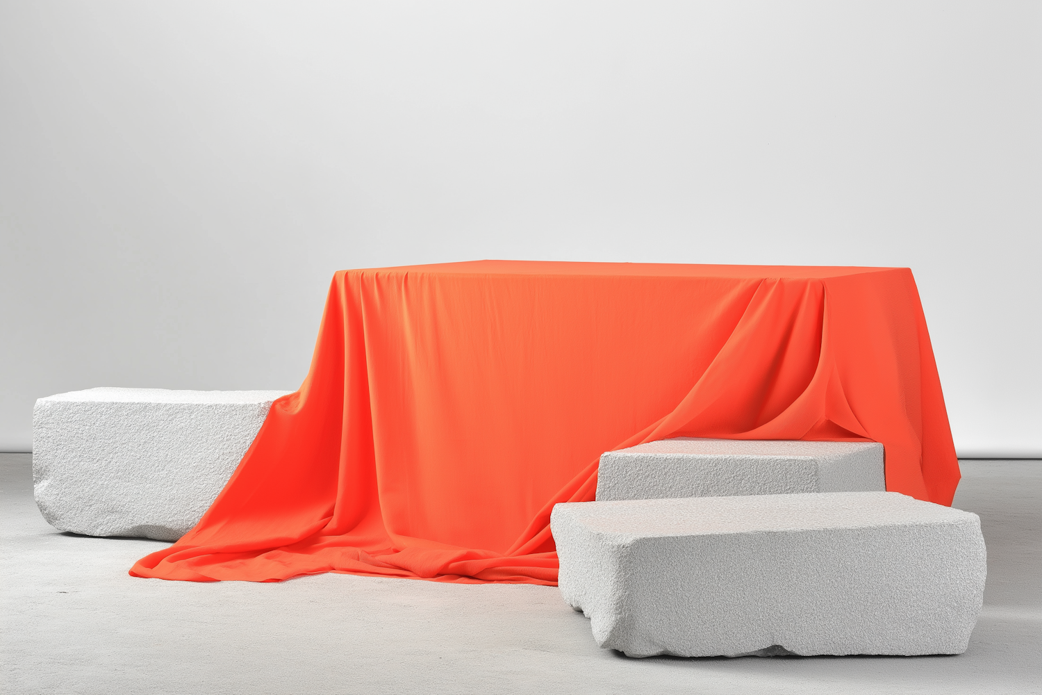 Bright orange fabric draped over a structure, surrounded by rough white blocks, creating a bold minimalist contrast in a modern setting.