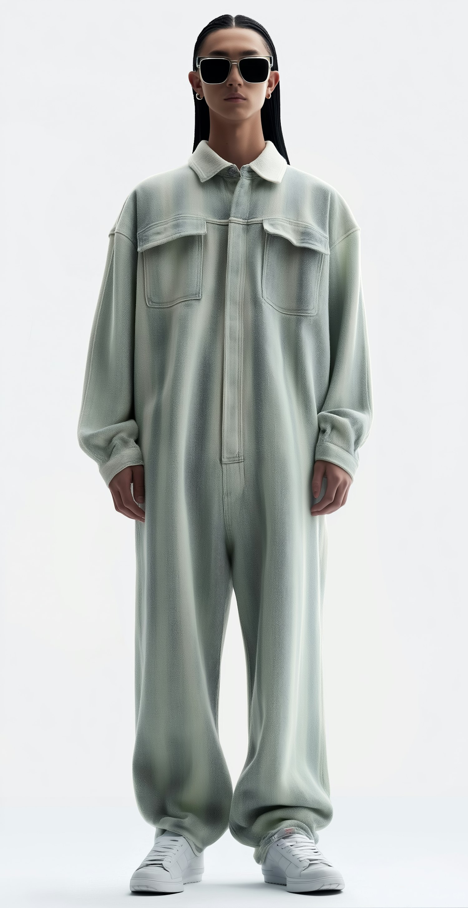 A person in a stylish, light-colored jumpsuit with sunglasses and white sneakers, standing against a plain white background.