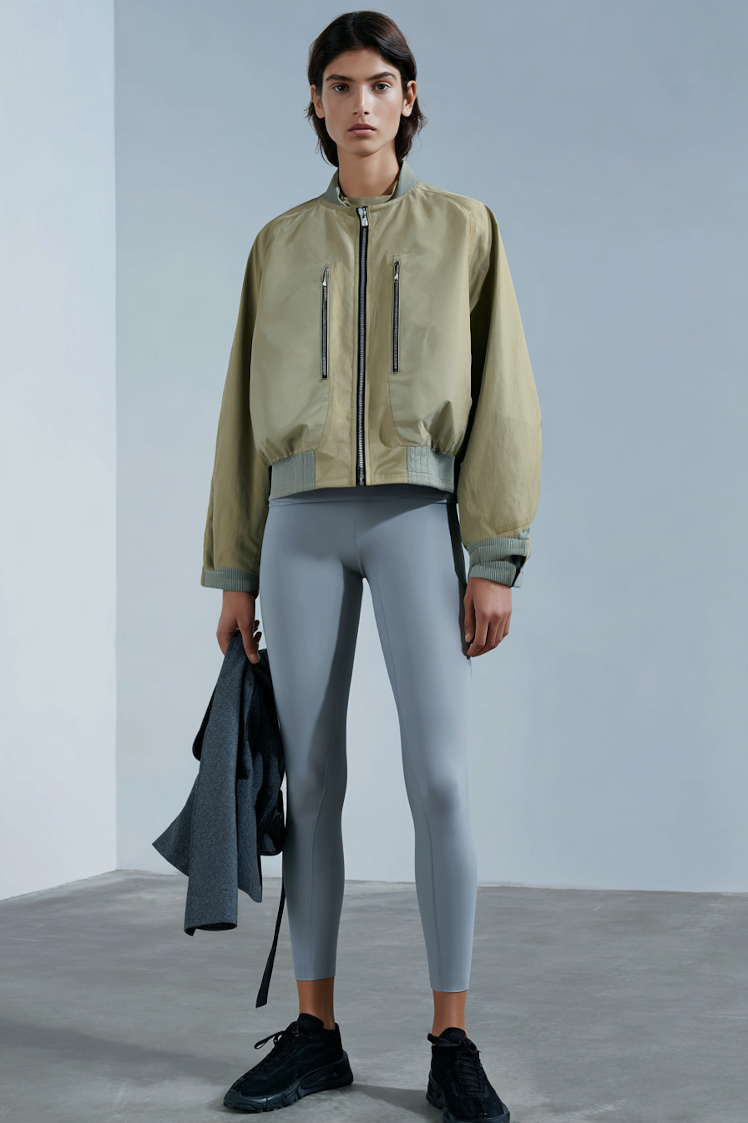 Stylish outfit featuring a light olive bomber jacket, gray leggings, and black sneakers, perfect for a modern and casual look.