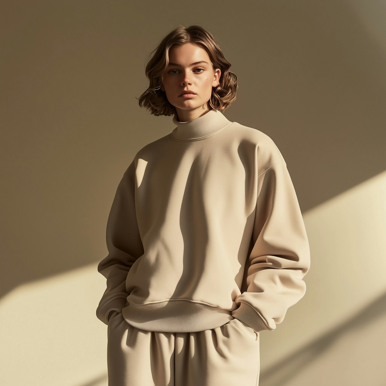 Minimalist fashion portrait of a woman in a beige oversized sweatshirt and pants, with soft lighting and a neutral background.