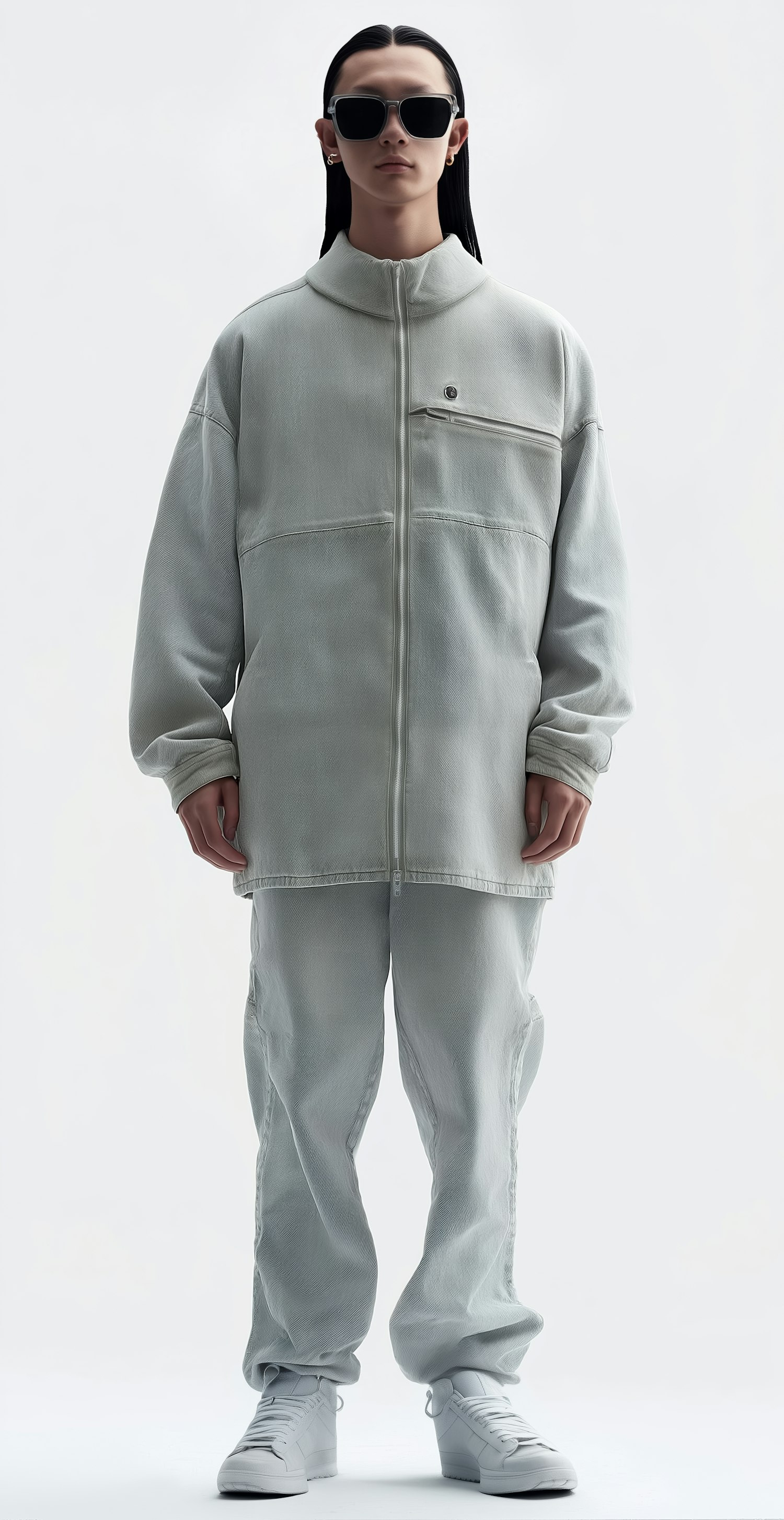A person in a minimalist light gray outfit with sunglasses and white sneakers, standing against a plain background.