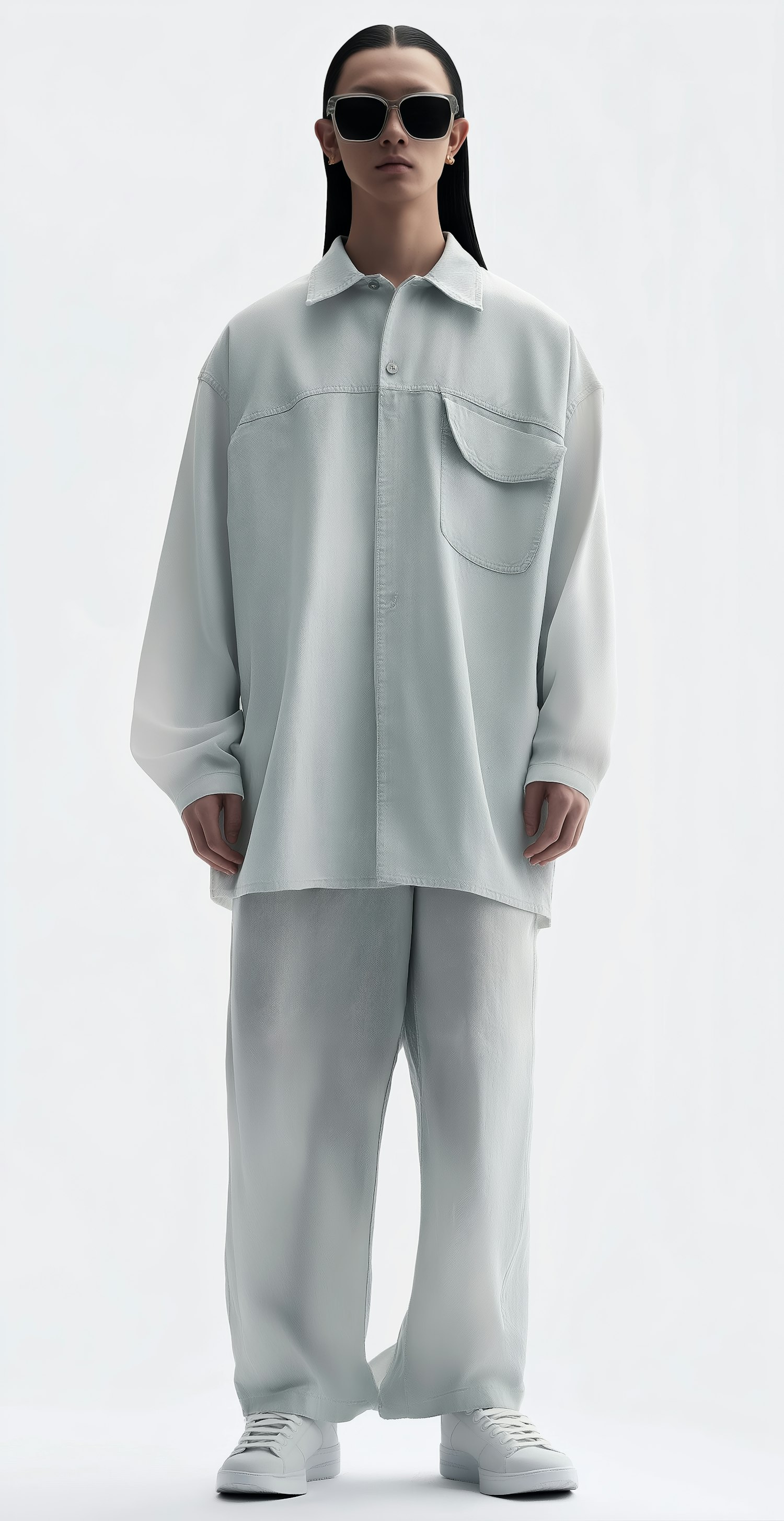 A person in a minimalist outfit with oversized shirt, loose pants, and sunglasses, standing against a plain background.